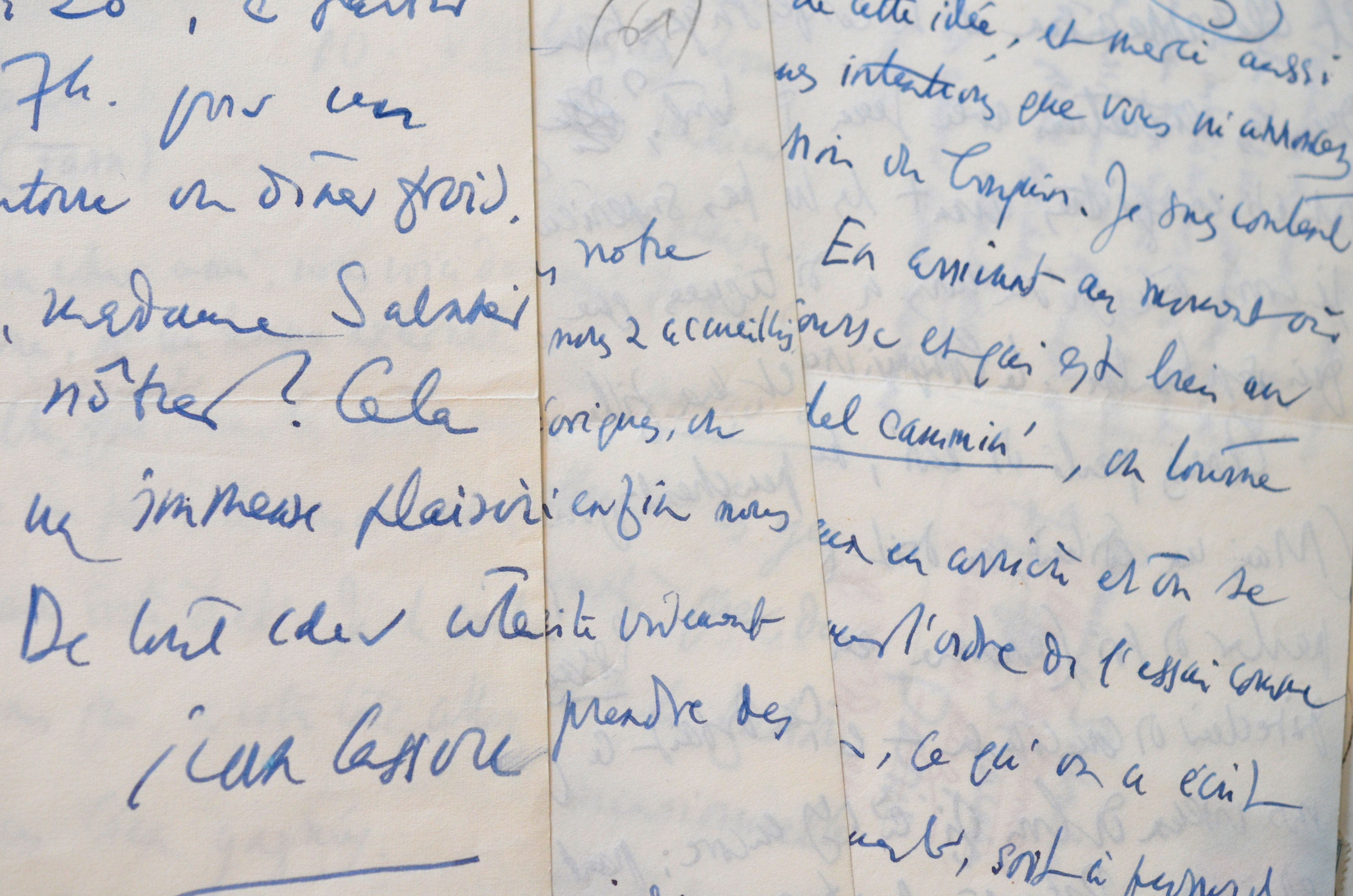 Jean Cassou (Bilbao, 1897/1986)Correspondance amicale de Jean Cassou évoquant la beauté de sa région de villégiature (le Tarn) et ses projets d'édition. "En tous cas la paix de notre jardin et mes loisirs me permettent de rêver au titre du prochain bouquin. Je relis votre lettre, si pleine d'amitié, d'intelligente coopération, de compréhension. Savez-vous que votre suggestion ne me paraît pas mauvaise du tout? Je me demande si elle n'est pas supérieure aux propositions assez sophistiquées que je vous avais faites. Ma femme et ma fille, d'ailleurs, le pensent, et donc penchent pour cette solution. Oui, ma foi, Parti Pris - Essais et colloques, ça dirait ce que j'ai envie de dire [...]". Il évoque longuement la publication d'entretiens et loue la médecine de province. "Oui, oui, mon cher ami, c'est en province, et dans la province d'au-dessous de la Loire qu'on trouve du savoir, de la cordialité, des êtres humains - la civilisation, quoi! [...]".