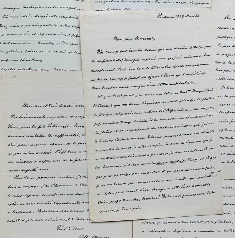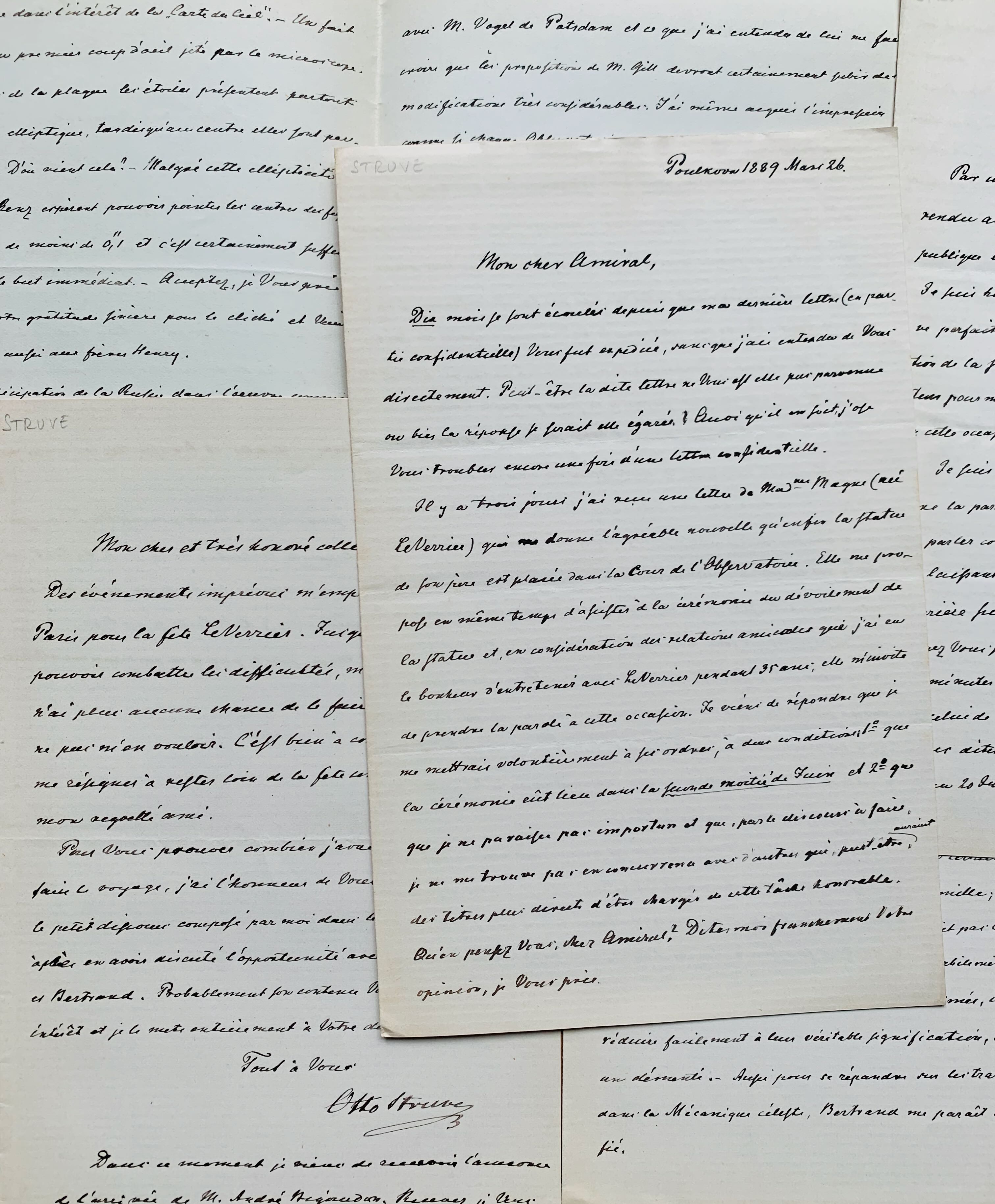 Otto Wilhelm von Struve (Tartu (Estonie), 1819/1905)Belle correspondance astronomique à Ernest Mouchez, en particulier au sujet de la Carte du Ciel. Il a reçu les clichés de l’éclipse de lune du 28 janvier, mais en fort mauvais état. « Cependant, malgré les égratignures, les étoiles sont fort bien visibles pour le microscope et un de mes aides M. Renz en a déjà commencé les mesures. En premier lieu ces mesures se font dans l’intérêt de la déduction la plus exacte des résultats d’observation fournis par l’éclipse de la lune […]. Un fait nous a frappé du premier coup d’œil jeté par le microscope, c’est qu’aux bords de la plaque, les étoiles présentent partout une figure un peu elliptique […]. Quant à la participation de la Russie dans l’œuvre commencée de la Carte du Ciel, il y aurait toute une histoire à vous raconter […]. Je dirai simplement que pour cette participation directe de Poulkova, les chances sont très faibles ; mais elles sont beaucoup plus fortes pour l’observatoire de Helsingfors, dont la latitude est même de 23’ plus boréale que celle de Poulkova, donc encore plus favorable pour les régions circumpolaires […] ». Il évoque également Le Verrier et l’inauguration de la statue élevée à sa mémoire, pour laquelle il compte faire le déplacement à Paris et prononcer un discours. Il parle également de la célébration du 50e anniversaire de l’observatoire de Poulkova. « L’Empereur m’a exprimé personnellement sa volonté qu’au moins jusqu’à ce jour je reste directeur de l’observatoire ». Mais il est fatigué et souhaite qu’on lui trouve un successeur. « Dans ce moment mon temps est principalement occupé par la description de notre grand réfracteur, que je compte publier le jour de notre fête semi-séculaire […] ».