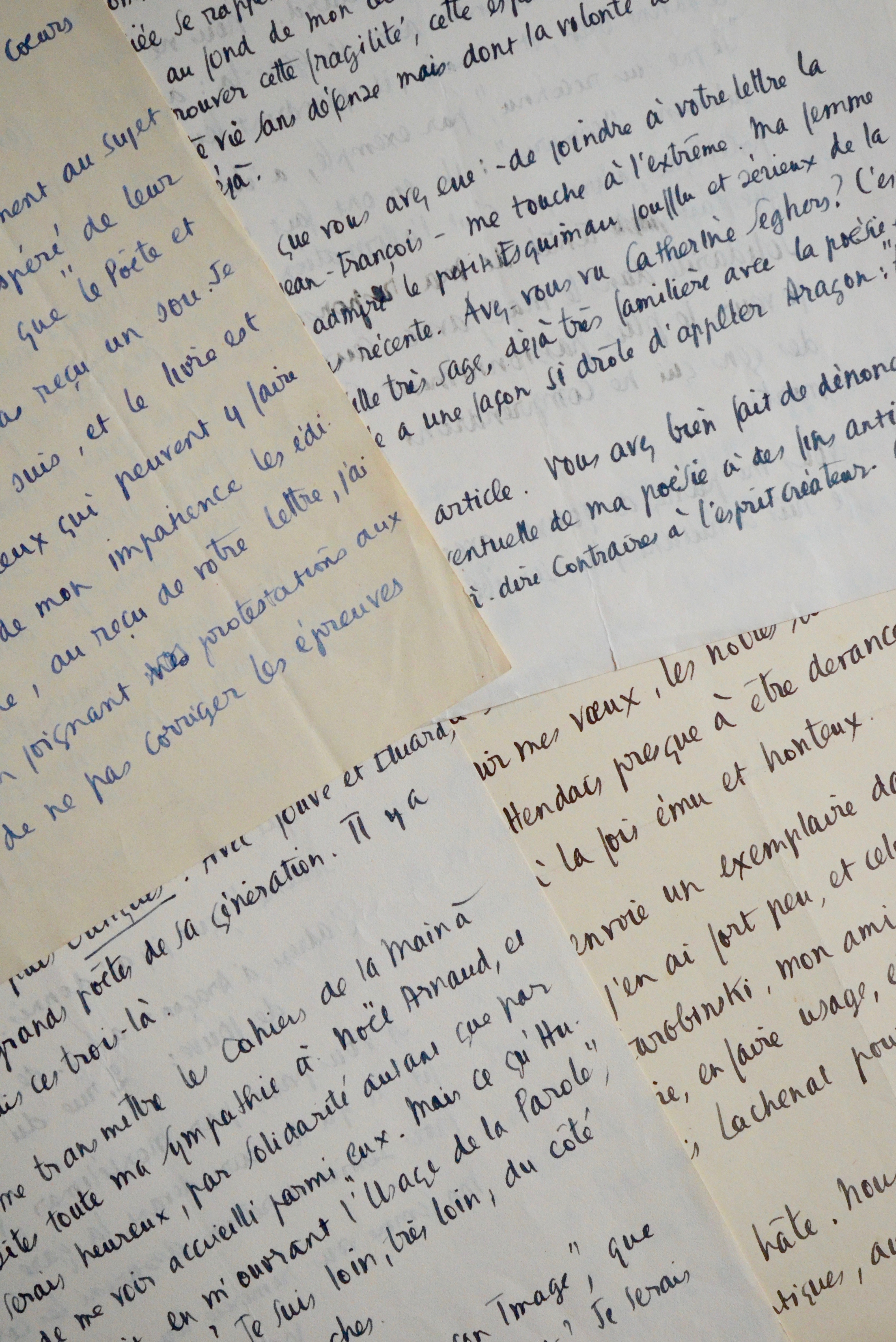 a dit -définitivement- Eluard. Nous ne pourrons jamais nous entendre avec ces gens là : au fond, ils le savent bien, et demain, ils prendront leur revanche [...]". Il évoque son admiration pour Pierre-Jean Jouve. "Vous me parlez de Jouve avec un attachement auquel je suis d'autant plus sensible, que j'ai pour lui la plus profonde affection, l'admiration la plus grande - presque sans réserve. Je m'honore de son amitié, à laquelle je dois le climat de confiance sans lequel les plus riches tentatives risquent d'avorter. Sans lui, j'eusse été seul devant cette brutale transformation de mon être que fut ma naissance à la poésie. Il est vrai que cette naissance même, je la luis dois. Reverdy? Il m'apprit, par ses poèmes, l'extrême ténuité des états les plus profonds, les plus critiques. Avec Jouve et Eluard, il est l'un des grands poètes de sa génération. Il y a Claudel, et puis ces trois là".