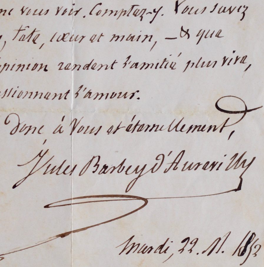 Lettre de Jules Barbey d'Aurevilly, adressée au journaliste, romancier et historien Jean-Marie Dargaud.