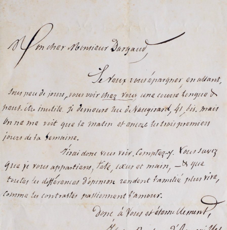 « Je veux vous épargner, en allant, sous peu de jours, vous voir chez vous, une course longue et peut-être inutile », jusqu'à chez lui 41 bis rue de Vaugirard. « Mais on ne me voit que le matin et encore les trois premiers jours de la semaine. J'irai donc vous voir. Vous savez que je vous appartiens, tête, coeur, et main, - & que toutes les différences d'opinion rendent l'amitié plus vive, comme les contrastes passionnent l'amour ».