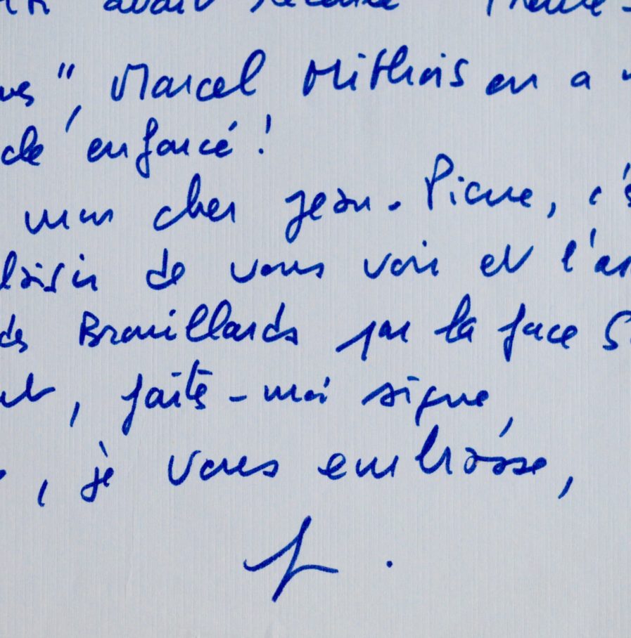 « [...] Le lendemain de votre première, je prenais l'avion du matin pour Toulon requis par d'ennuyeux repérages [pour Vivement dimanche !], c'est pourquoi je ne me suis pas présenté dans l'embrasure de votre loge pour vous féliciter. Je vous ai trouvé très bien et très beau. Le sujet de la pièce est extraordinairement neuf. De retour chez moi j'ai consulté les Mémoires de H.R. Lenormand, les Souvenirs de Jacques Porel, ceux d'Albert Carré, les Confessions de Céleste Mogador, l'Autobiographie de Louis Verneuil, nulle part je n'ai retrouvé ce canevas : « Une femme et ses deux amants s'efforcent une soirée durant, d'éteindre un mégot de cigarette coincé dans la rainure d'un petit meuble ». Le théoricien du théâtre Georges Polti avait recensé « Trente-six situations dramatiques », Marcel Mithois en a inventé une 37ème. Sophocles enfoncé ! Blague à part, mon cher Jean-Pierre, C'est toujours un grand plaisir de vous voir et l'ascension de votre nid d'aigle des Brouillards par la face Sud me tente énormément, faites-moi signe. Marisa [Pavan] et vous, je vous embrasse. F. ».