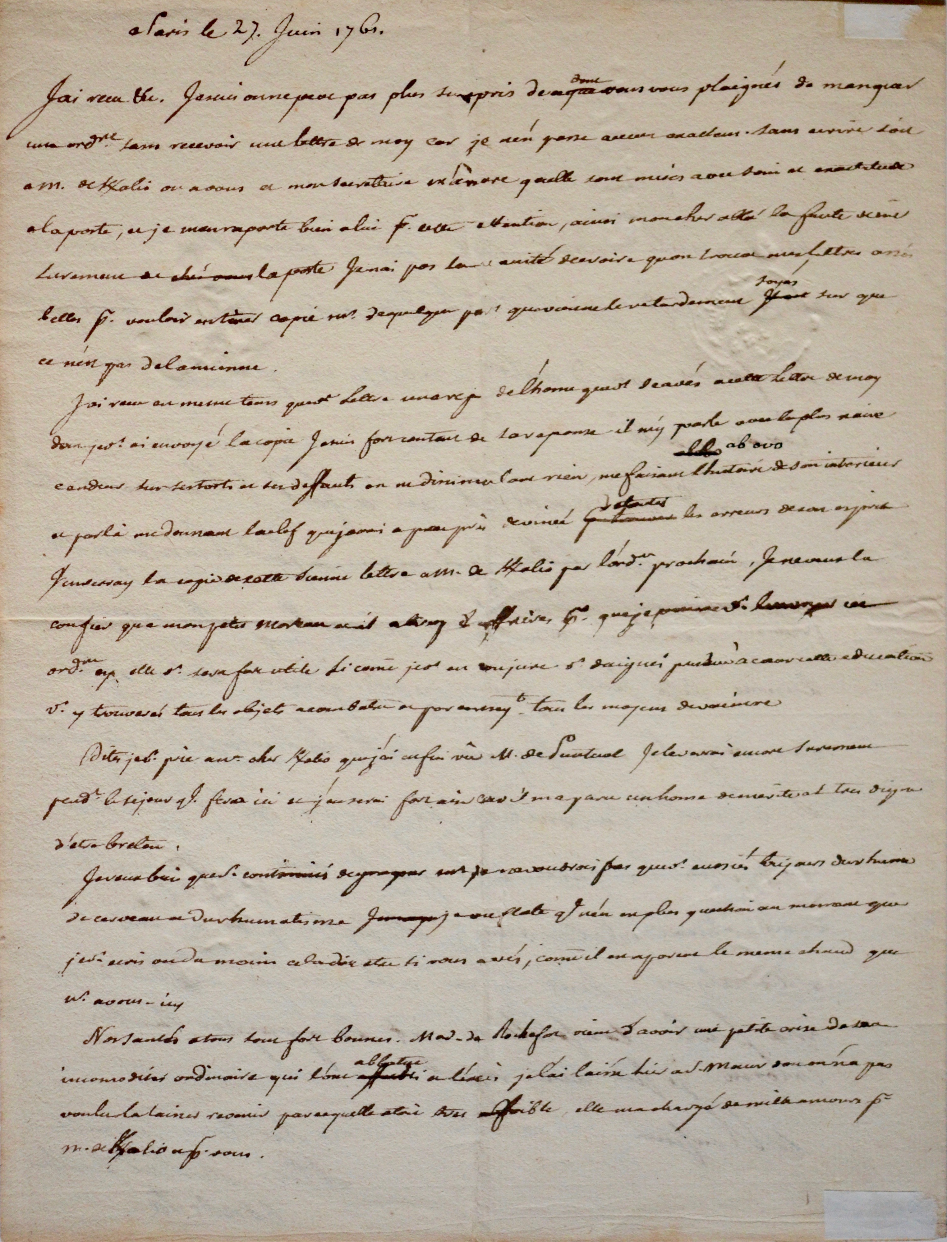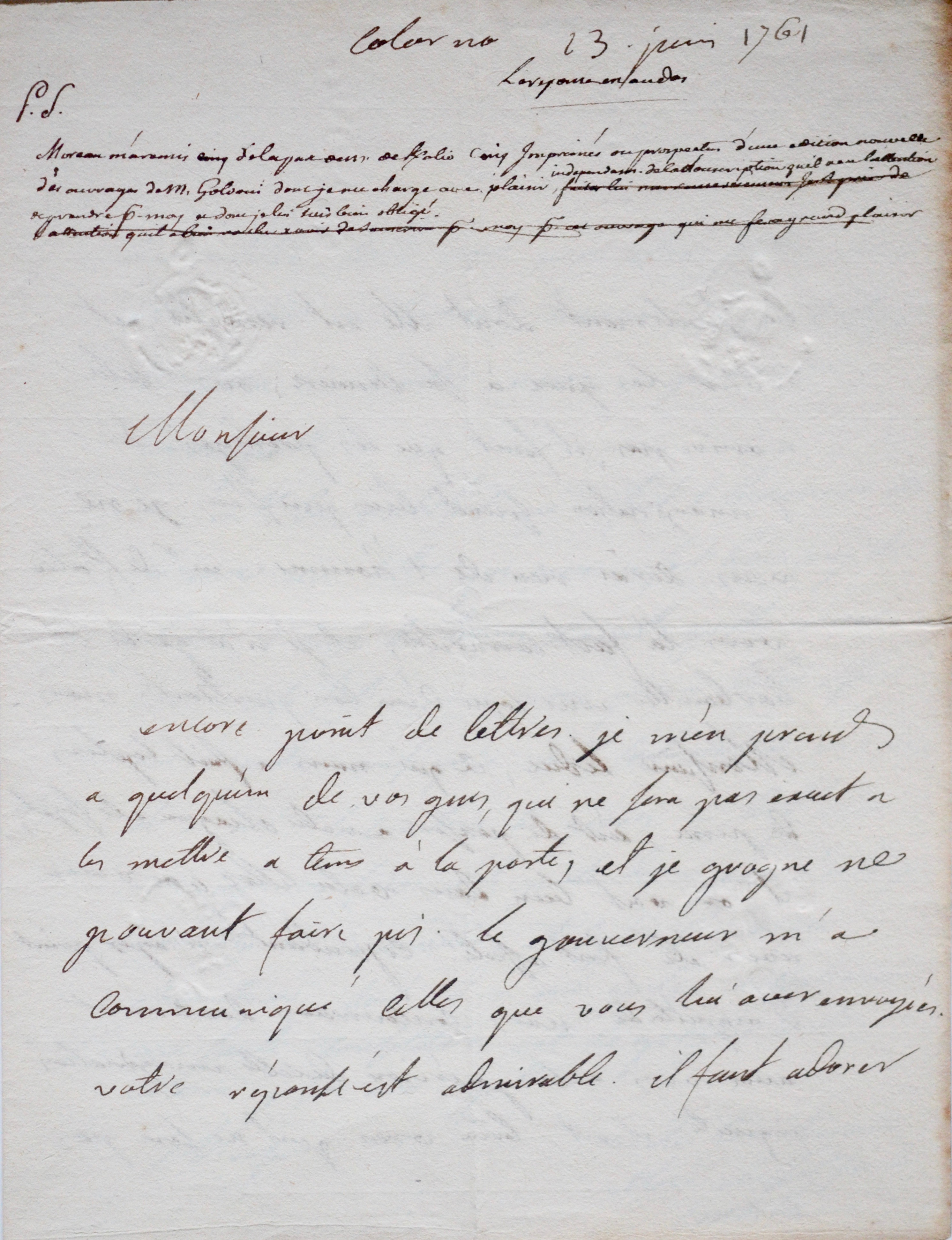 Le duc lui répond au verso du second feuillet et en-tête du premier : « Moreau [secrétaire du duc de Nivernais] m'a remis de la part de M. de Keralio cinq imprimés ou paquets d'une édition nouvelle des ouvrages de M. Goldoni [le dramaturge Carlo Goldoni] dont je me charge avec plaisir [...] Je ne on ne peut pas plus surpris de ce dont vous vous plaignés de manquer une ordre sans recevoir une lettre de moy car je n'en passe aucun exactement sans écrire [...] ». (Paris, 27 juin 1761, 1 p. in-4).