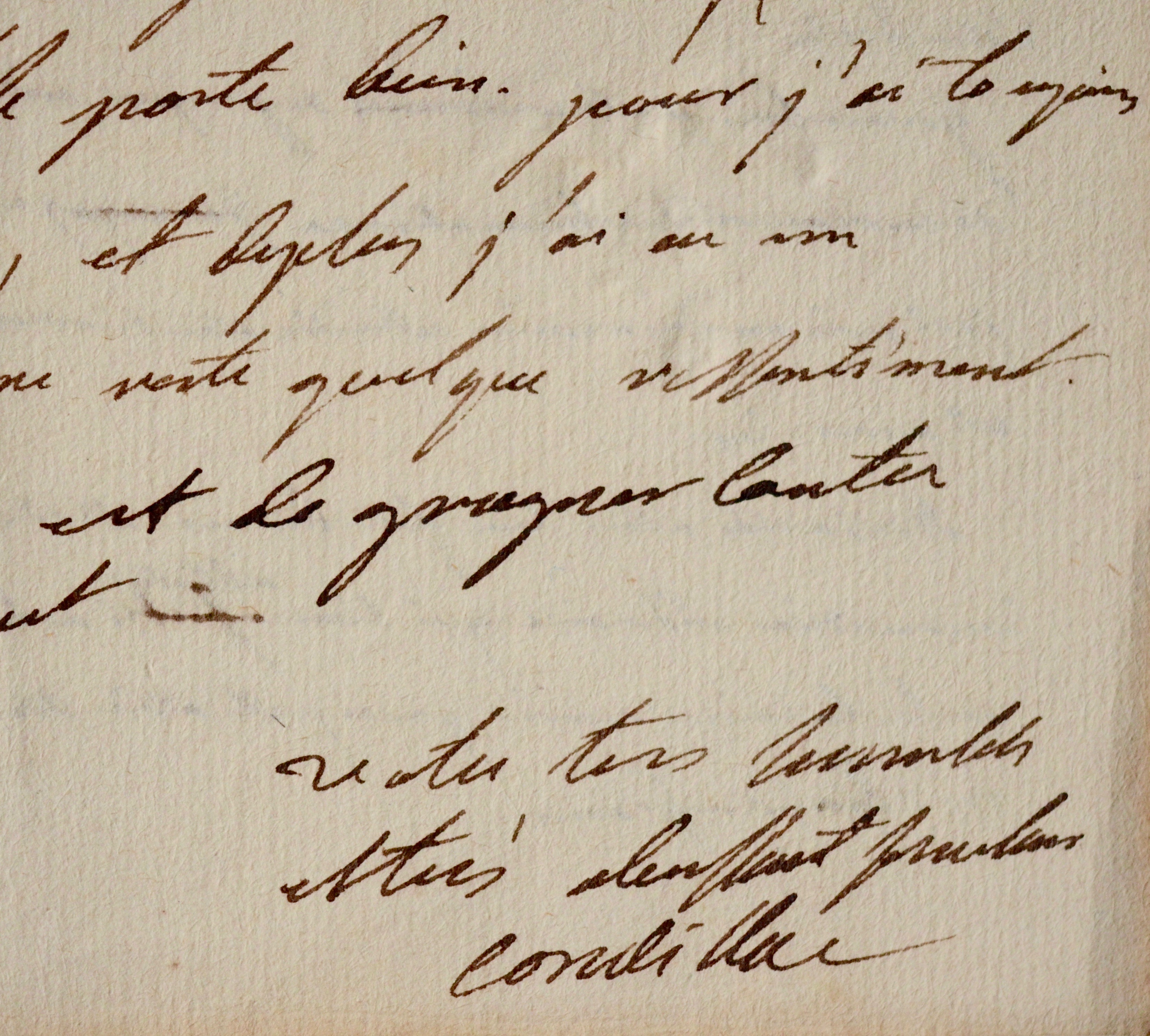 Étienne Bonnot de Condillac (Grenoble, 1714/1780)Belle lettre d'Étienne Bonnet de Condillac, adressée au duc Louis-Jules Mancini-Mazarin avec sa réponse autographe au verso.