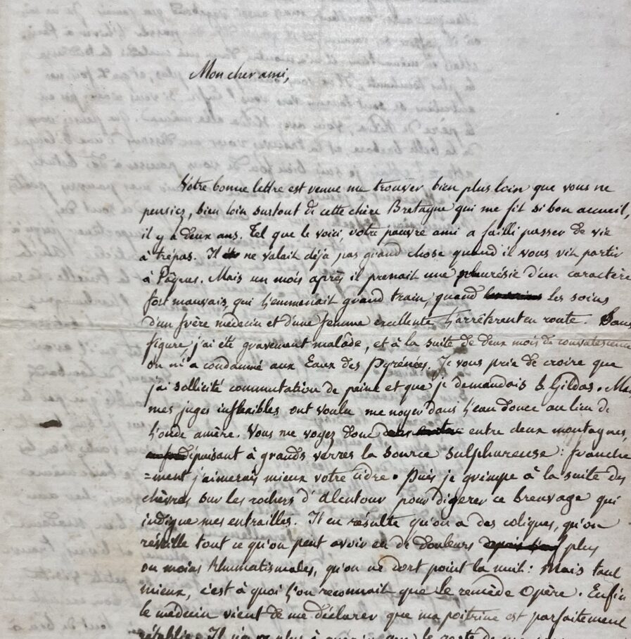 Je vous prie de croire que j’ai sollicité commutation de peine, et que je demandais S. Gildas. Mais mes juges inflexibles ont voulu me noyer dans l’eau douce au lieu de l'onde amère. Vous me voyez donc entre deux montagnes puisant à grands verres la source sulfureuse : franchement j’aimerais mieux votre cidre. Puis je grimpe à la suite des chèvres sur les rochers d'alentours pour digérer ce breuvage qui indigne mes entrailles. Il en résulte qu’on a des coliques, qu’on réveille tout ce qu’on peut avoir eu de douleurs plus ou moins rhumatismales, qu’on ne dort point la nuit : mais tout mieux, c’est quoi l’on reconnaît que le remède opère. Enfin le médecin vient de me déclarer que ma poitrine est parfaitement rétablie. Il n’y a plus à guérir que le reste de ma personne ravagée par les eaux, comme les flancs de la montagne par les torrents".