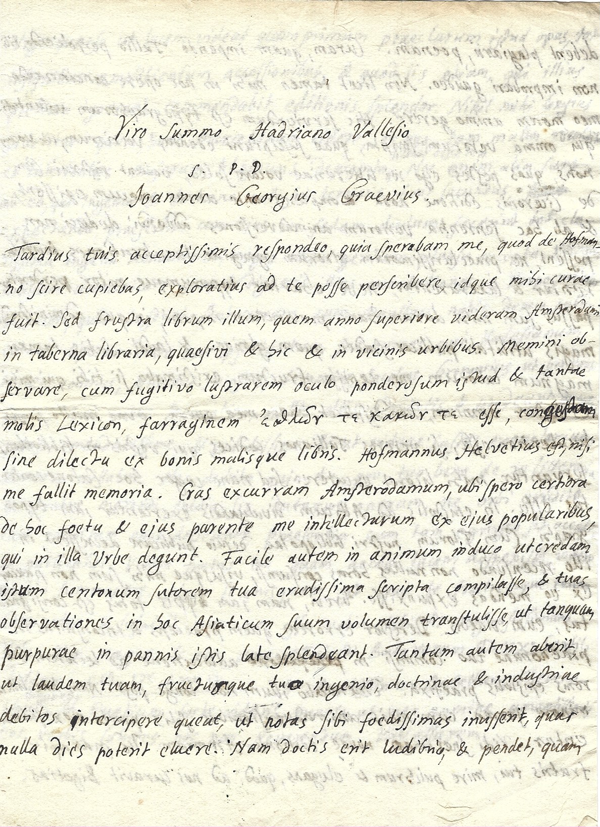 Johann Georg Grævius (Naumbourg, 1632/1703)Belle et rare lettre de Graevius à Adrien de Valois, écrite en latin, en particulier sur son travail sur Cicéron, dont voici la traduction : "Je réponds assez tard à ta chère lettre, car j’espérais pouvoir t’écrire plus précisément ce que tu voulais savoir d’Hofman. Je m’en suis soucié mais le livre que j’avais vu l’anné dernière en librairie à Amsterdam, je l’ai cherché en vain ici et dans les villes voisines. Je me souviens m’être fait la remarque, alors que je parcourais d’un oeil fuyant ce lourd dictionnaire et d’un si gros volume, que c’était un salmigondis de belles choses et de mauvaises, prises sans discernement de bons livres comme de mauvais. Hofmann est suisse si j’ai bonne mémoire. Demain je fais une course à Amsterdam où j’espère m’informer sur ce rejeton et son parent en questionnant ses compatriotes qui vivent dans cette ville. Mais je suis bien prêt à croire que ce faiseur de centons a pillé tes écrits si érudits et a inséré tes observations dans son volume plein d’enflure pour qu’elles brillent de loin comme de la pourpre au milieu des ces loques. Cependant il sera bien incapable de voler ta gloire et les fruits de ton génie, de ta science et de ton zèle d’autant qu’il a imprimé sur son nom une tâche des plus déshonorantes qui jamais ne pourra être effacée. Car les savants se moqueront de lui et il perdra sa peine, comme le mérite les plagiaires.