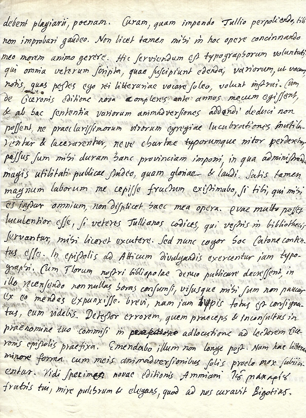 Je me réjouis que tu loue mon travail à mettre la dernière main à Cicéron. Pourtant je n’en fais pas à ma guise en voulant perfectionner cet ouvrage. Ici il faut en passer par la volonté des imprimeurs qui veulent accompagner l’édition des textes classiques de notes de divers auteurs, si je puis dire, que je nomme toujours les pestes de la littérature. Mais comme ils avaient négocié avec moi depuis longtemps cette nouvelle édition de Cicéron et ne voulaient pas démordre de cette volonté d’ajouter des gloses diverses, pour éviter que les études remarquables de tant d’éminents savants ne soient défigurées et mises en pièces ou bien que la beauté du papier et des caractères ne soit perdue, j’ai accepté cette dure mission, en ayant à cœur de la mener plus pour l’utilité publique que pour ma gloire. J’estimerai avoir assez recueilli le fruit de mes travaux si toi – qui m’es autant que tous les autres – tu aimes mon travail. Lequel pourrait être beaucoup plus fécond s’il m’était permis de sortir les vieux manuscrits cicéroniens qui sont gardés dans vos bibliothèques. Mais je dois me contenter de Caton. Les imprimeurs s’appliquent à présent à éditer les lettres à Atticus. Nos libraires ayant décidé une nouvelle édition de Florus, j’ai passé quelques heures à sa recension et pense l’avoir expurgé de beaucoup d’erreurs. Tu le verras sous peu car il n’est pas encore tout à fait imprimé.