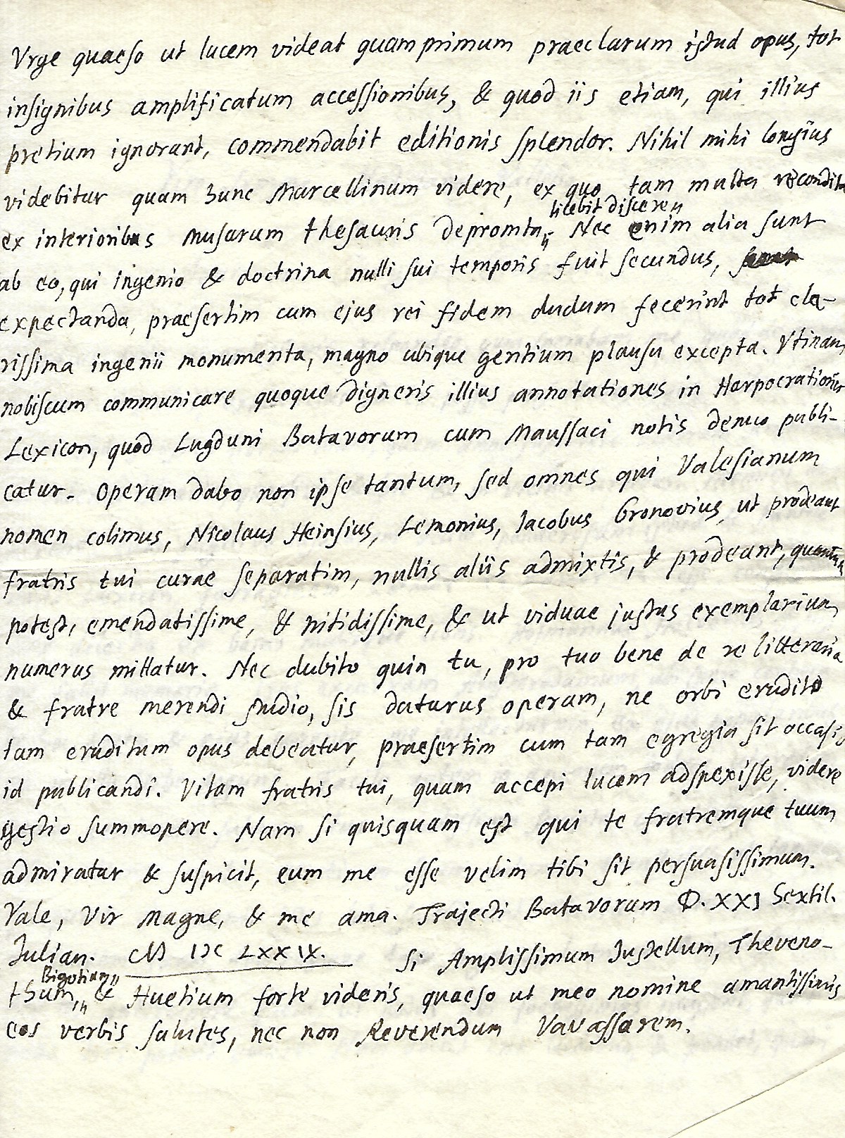 [...] Puisses-tu aussi nous faire la grâce de nous communiquer ses annotations sur le dictionnaire d’Harpocrate qui paraît à La Haye commenté par Maussac. Je tâcherai non seulement moi mais tous ceux qui honorent le nom de Valois : Nicolas Heinsius, Lemonius, Jacob Gronovius, que les oeuvres de ton frère paraissent séparément, sans adjonction d’autres auteurs, et cela le plus correctement et élégamment possible et qu’un nombre d’exemplaires suffisant soit envoyé à sa veuve.