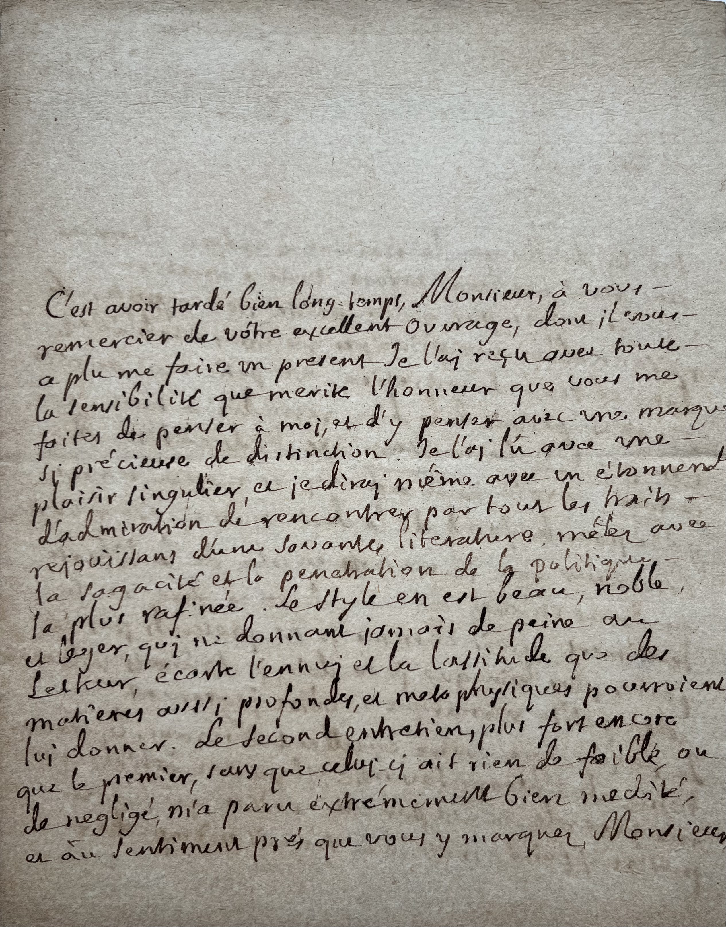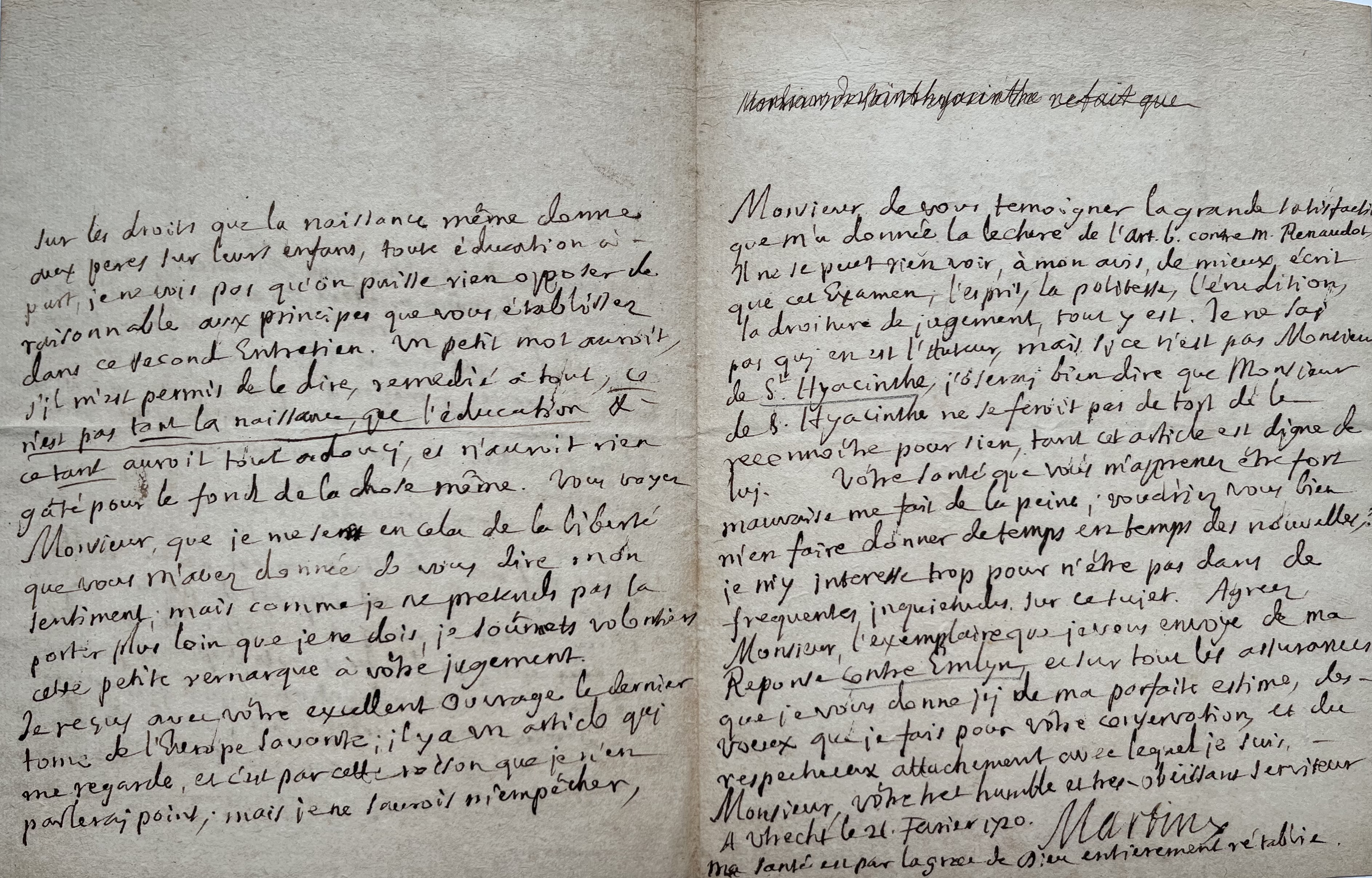 «Je l'ai lu avec un plaisir singulier, et je dirai même avec un étonnement d'admiration de rencontrer partout les traits réjouissants d'une savante littérature, mêlée avec la sagacité et la pénétration de la politique la plus raffinée. Le style en est beau, noble, et léger, qui ne donnant jamais de peine au lecteur, écarte l'ennui et la lassitude que des matières aussi profondes et métaphysiques pourroient lui donner. Le second entretien, plus fort encore que le premier […] m'a paru extrêmement bien médité, et au sentiment près que vous y marquez, Monsieur, sur les droits que la naissance même donne aux pères sur leurs enfans, toute éducation à part. Je ne vois pas qu'on puisse rien opposer de raisonnable aux principes que vous établissez dans ce second entretien. Un petit mot auroit, s'il m'est permis de la dire, remédié à tout, ce n'est pas tant la naissance que l'éducation, &, ce tant auroit tout adouci, et n'auroit rien gâté pour le fond de la chose même […]». Il a également reçu le dernier tome de l'Europe savante. «Il y a un article qui me regarde, et c'est par cette raison que je n'en parlerai point; mais je saurois m'empêcher, Monsieur, de vous témoigner la grande satisfaction que m'a donnée la lecture de l'art. 6 contre M. Renaudot. Il ne se peut rien voir, à mon avis, de mieux écrit que cet examen; l'esprit, la politesse, l'érudition, la droiture de jugement, tout y est. Je ne sais pas qui en est l'auteur, mais si ce n'est pas Monsieur de St Hyacinthe, j'oserai bien dire que monsieur de S. Hyacinthe ne se feroit pas de tort de le reconnoître pour sien, tant cet article est digne de lui […]».