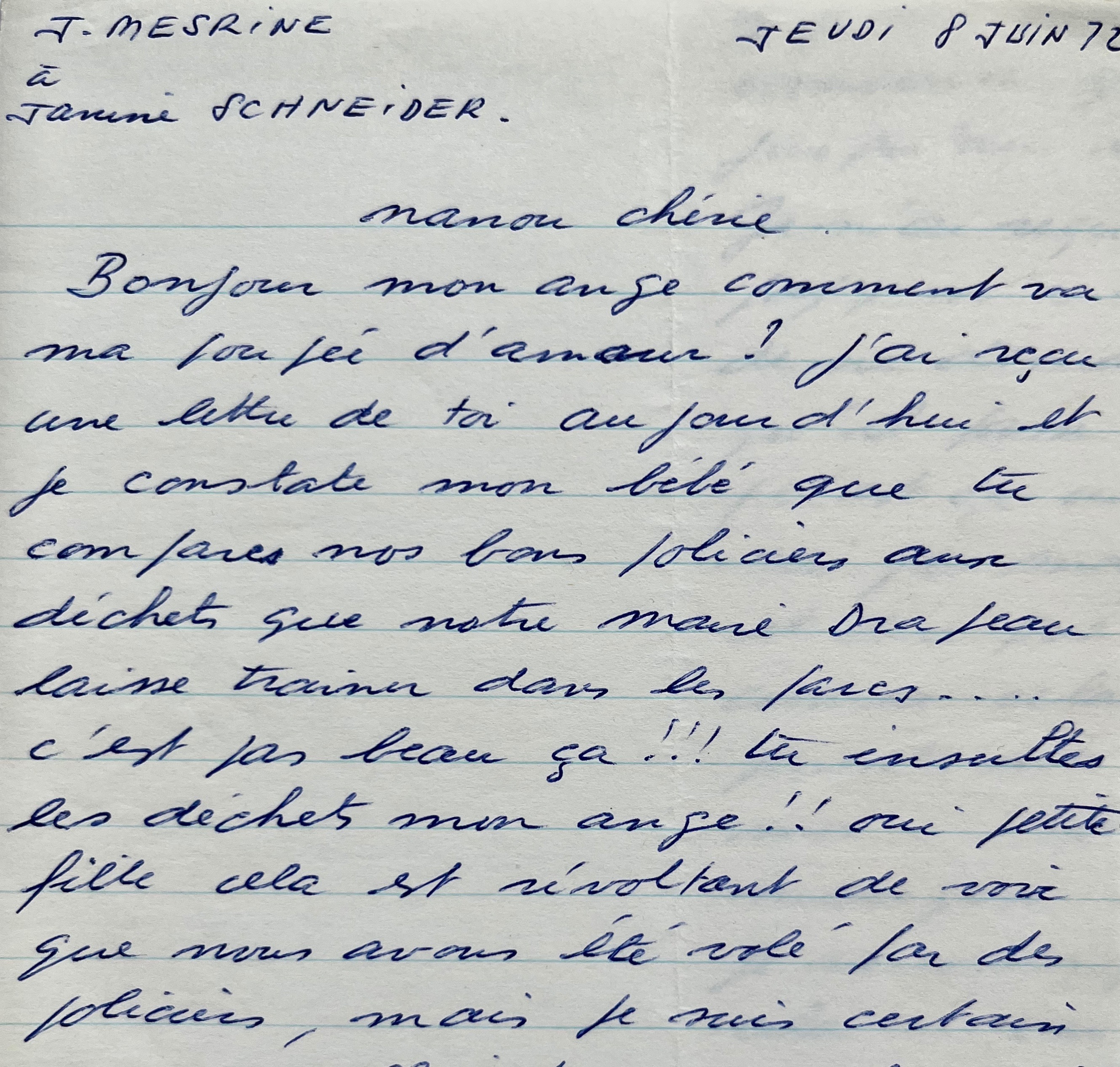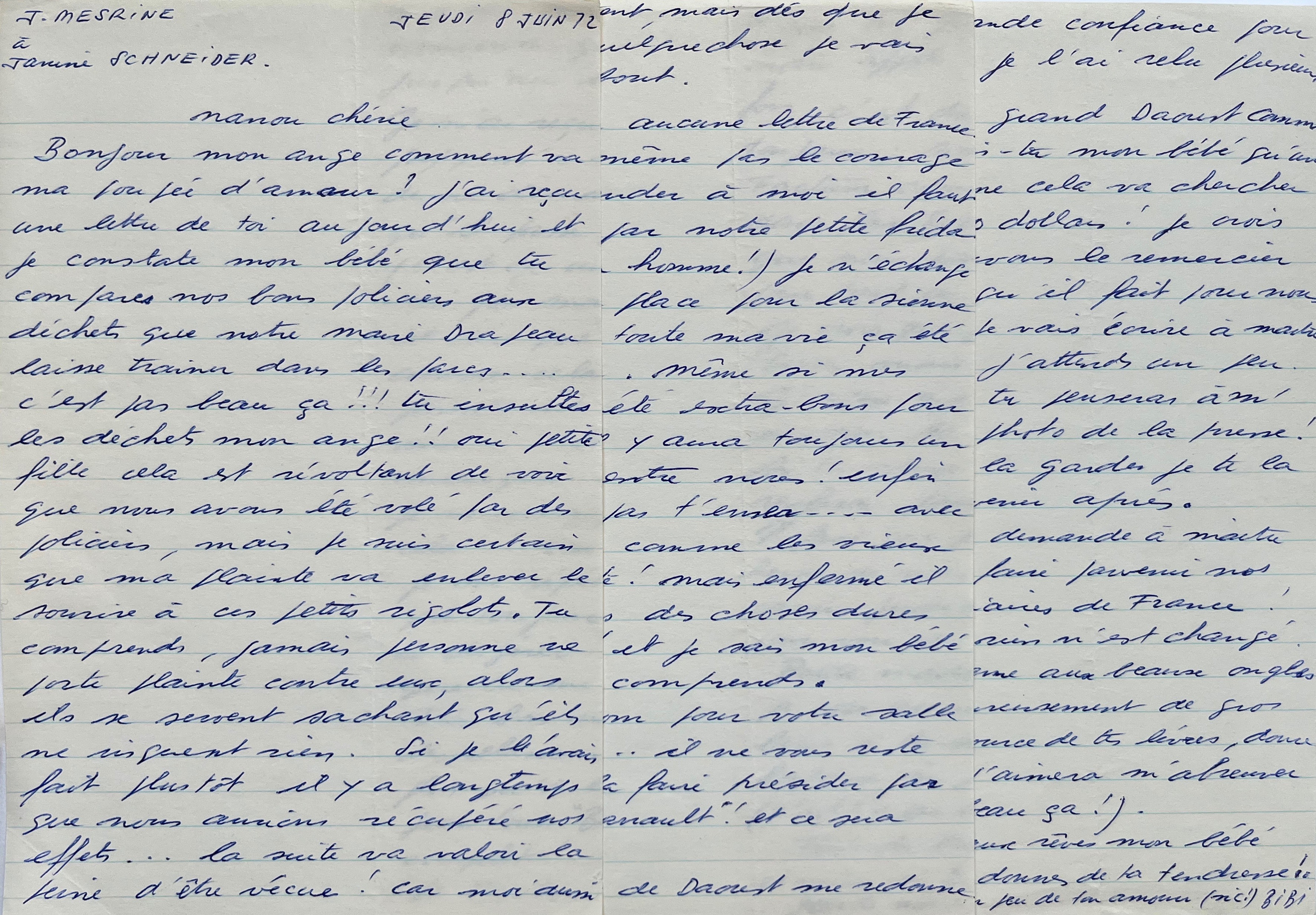 Belle lettre d’amour de Jacques Mesrine à sa maîtresse, depuis la prison de Saint-Vincent-de-Paul, au Canada