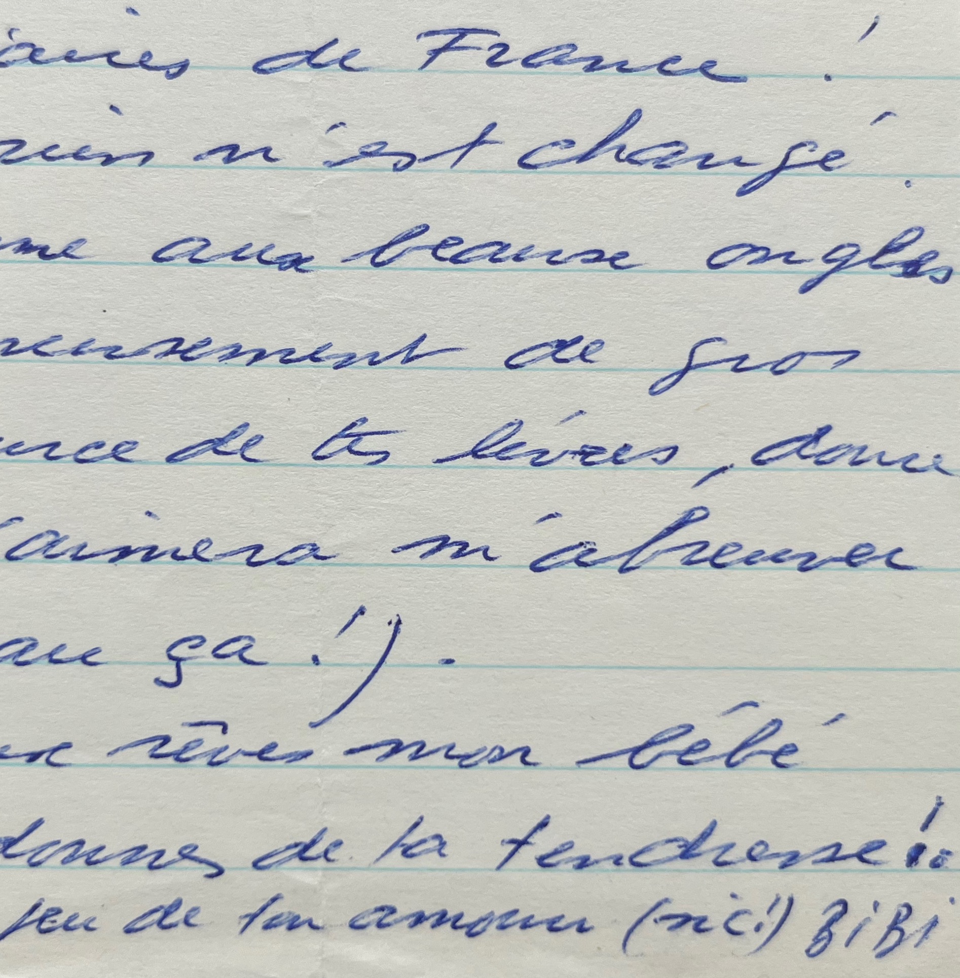 Il conclut sa lettre ainsi : "Petite madame aux beaux ongles je pose amoureusement de bros bécot à la source de tes lèvres, dame fontaine où j'aimerais m'abreuver (c'est t'y pas beau ça!). Fais de beaux rêves mon bébé et même si tu donnes de la tendresse!... garde moi un peu de ton amour (sic!)". Il signe "Bibi".