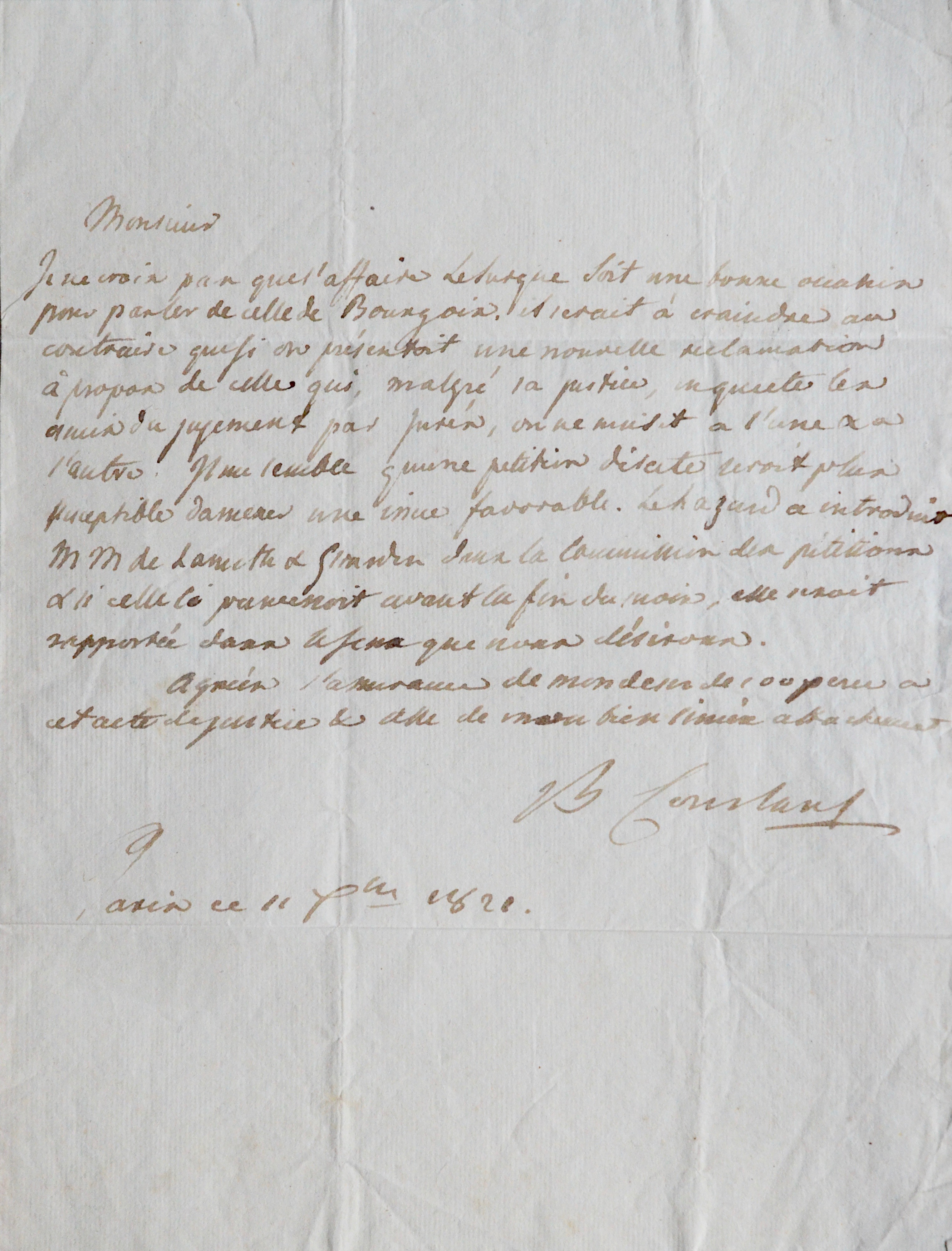 « Monsieur. Je ne crois pas que l’affaire Lesurque soit une bonne occasion pour parler de celle de Bourgois [?], il serait à craindre au contraire que si on présentoit une nouvelle réclamation à propos de celle qui, malgré sa justice, inquiète les amis du jugement parjurés on ne nuisit à l'une & à l'autre. Il me semble qu'une pétition directe seroit plus suiceptible d'amener une issue favorable. Le hazard a introduit M. M. de Lamette & Girardin dans la commission des pétitions et si celle-ci parraissoit avant la fin du mois elle seroit rapportée dans le sens que nous désirons. Malgré l'assurance de mon désir de coopérer à cet acte de justice et celle de mon bien sincère attachement [...] ».