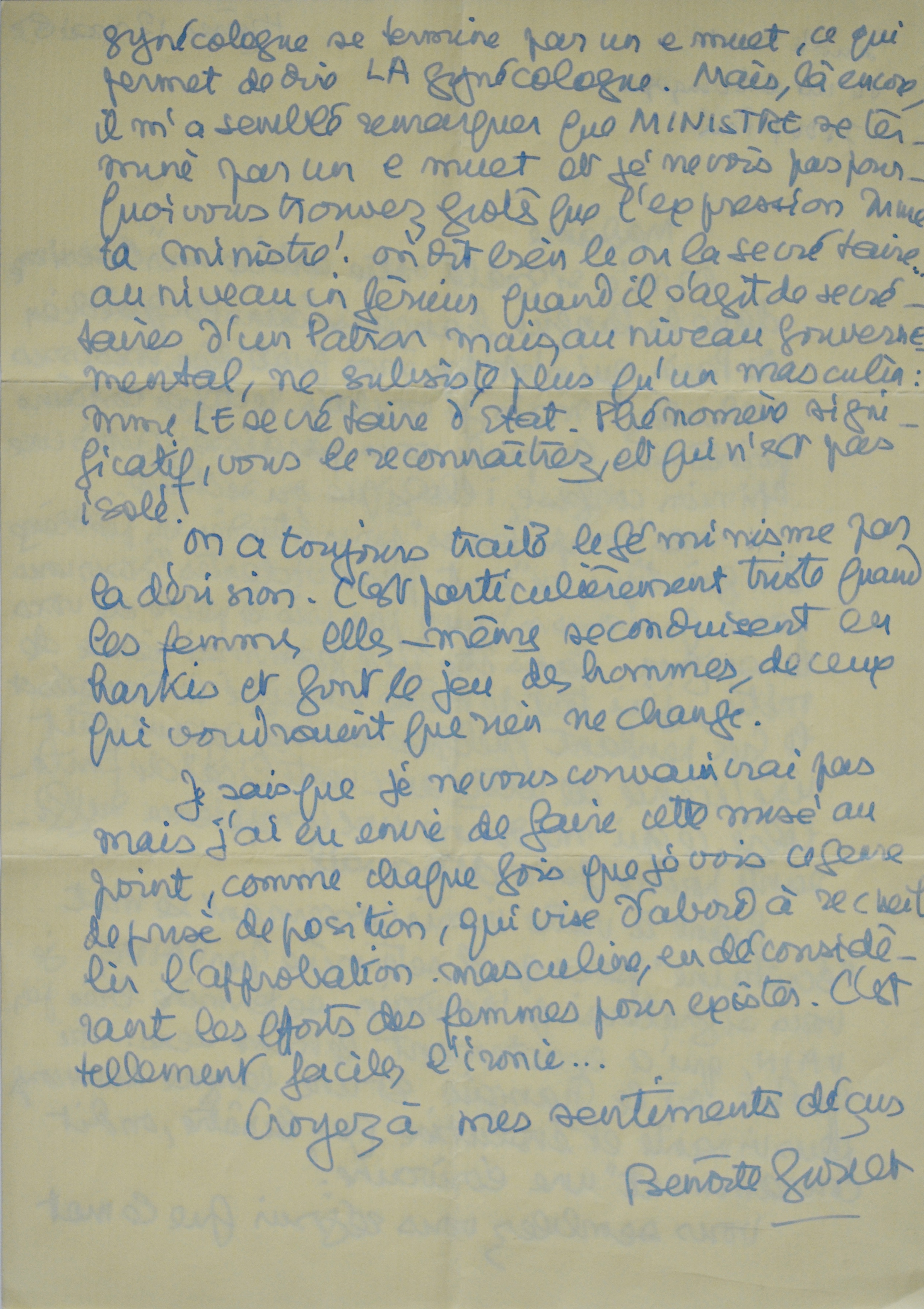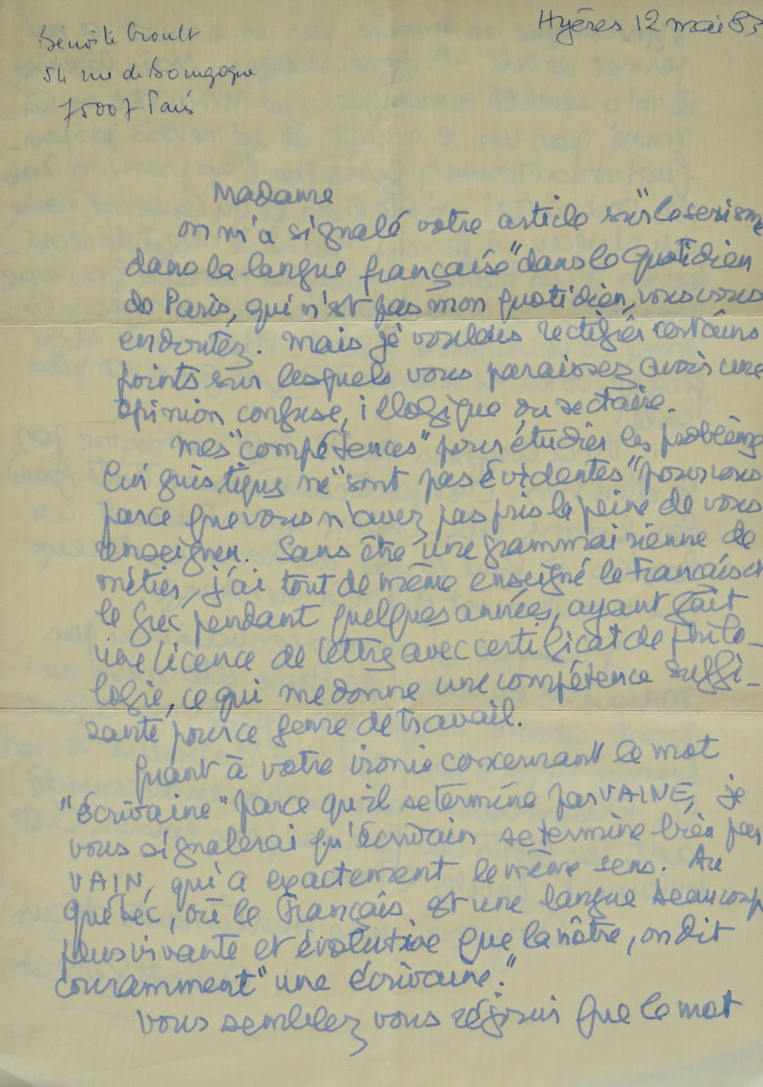 "On m'a signalé votre article sur le "sexisme dans la langue française" dans le quotidien de Paris, qui n'est pas mon quotidien, vous vous en doutez. Mais je voudrais rectifier certains points sur lesquels vous paraissez avoir une opinion confuse, illogique ou sectaire. Mes "compétences" pour étudier les problèmes linguistiques ne "sont pas évidentes" pour vous parce que vous n'aurez pas pris la peine de vous renseigner. Sans être une grammairienne de métier, j'ai tout de même enseigné le français et le grec pendant quelques années, ayant fait une licence de lettres avec certificat de philologie, ce qui me donne une compétence suffisante pour ce genre de travail. Quant à votre ironie concernant le mot "écrivaine" parce qu'il se termine par VAINE, je vous signalerai qu'écrivain se termine bien par VAIN, qui a exactement le même sens [...]". Elle liste ensuite plusieurs autres mots (gynécologue, ministre) dont la prononciation contredit sa correspondante. "On a toujours traité le féminisme par la dérision. C'est particulièrement triste quand les femmes elles-mêmes se conduisent en harkis et font le jeu des hommes, de ceux qui voudraient que rien ne changent. Je sais que je ne vous convaincrai pas mais j'ai eu une envie de faire cette mise au point, comme chaque fois que je vois ce genre de prise de position, qui vise d'abord à recueillir l'approbation masculine, en déconsidérant les efforts des femmes pour exister. C'est tellement facile l'ironie... Croyez à mes sentiments déçus".