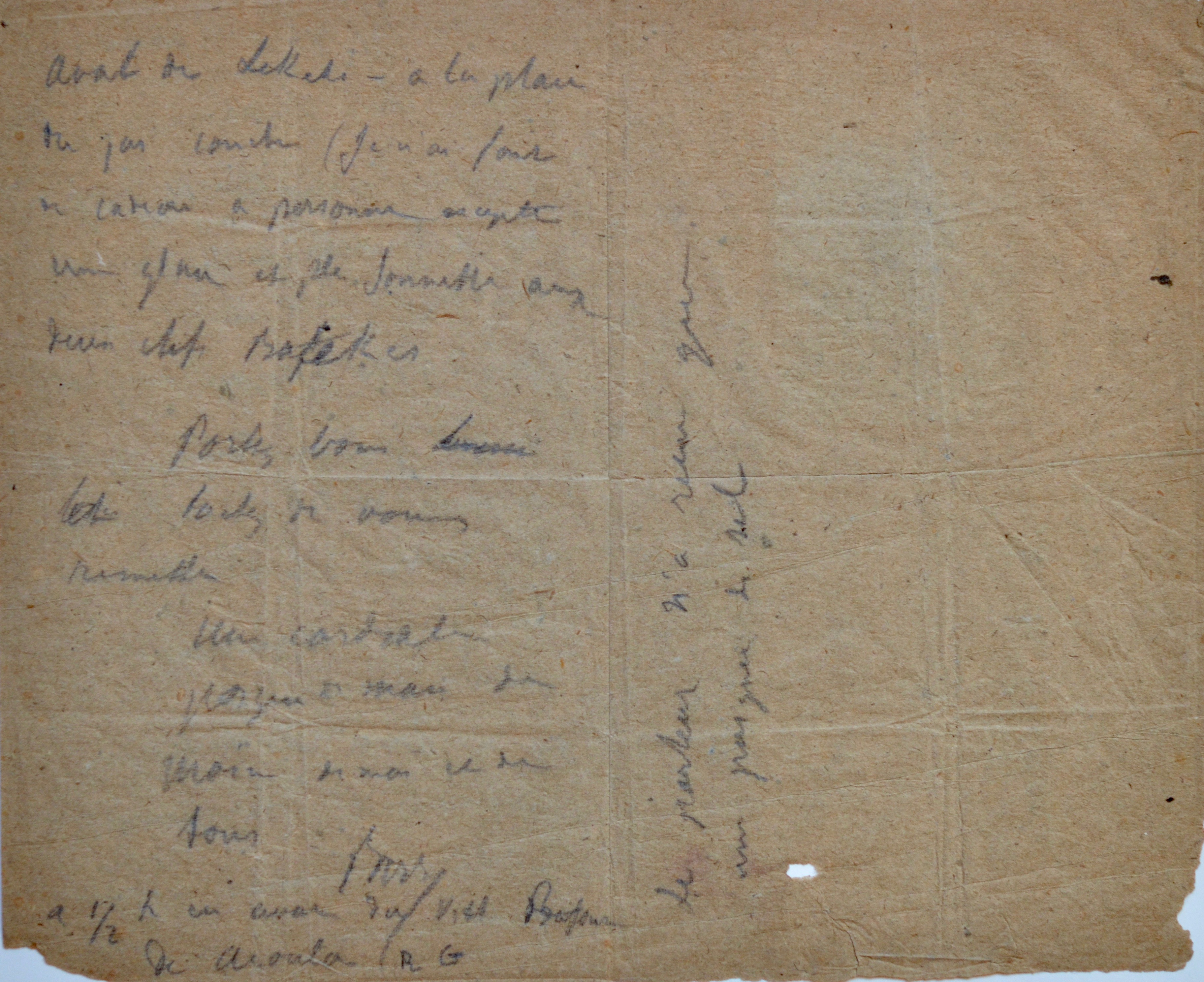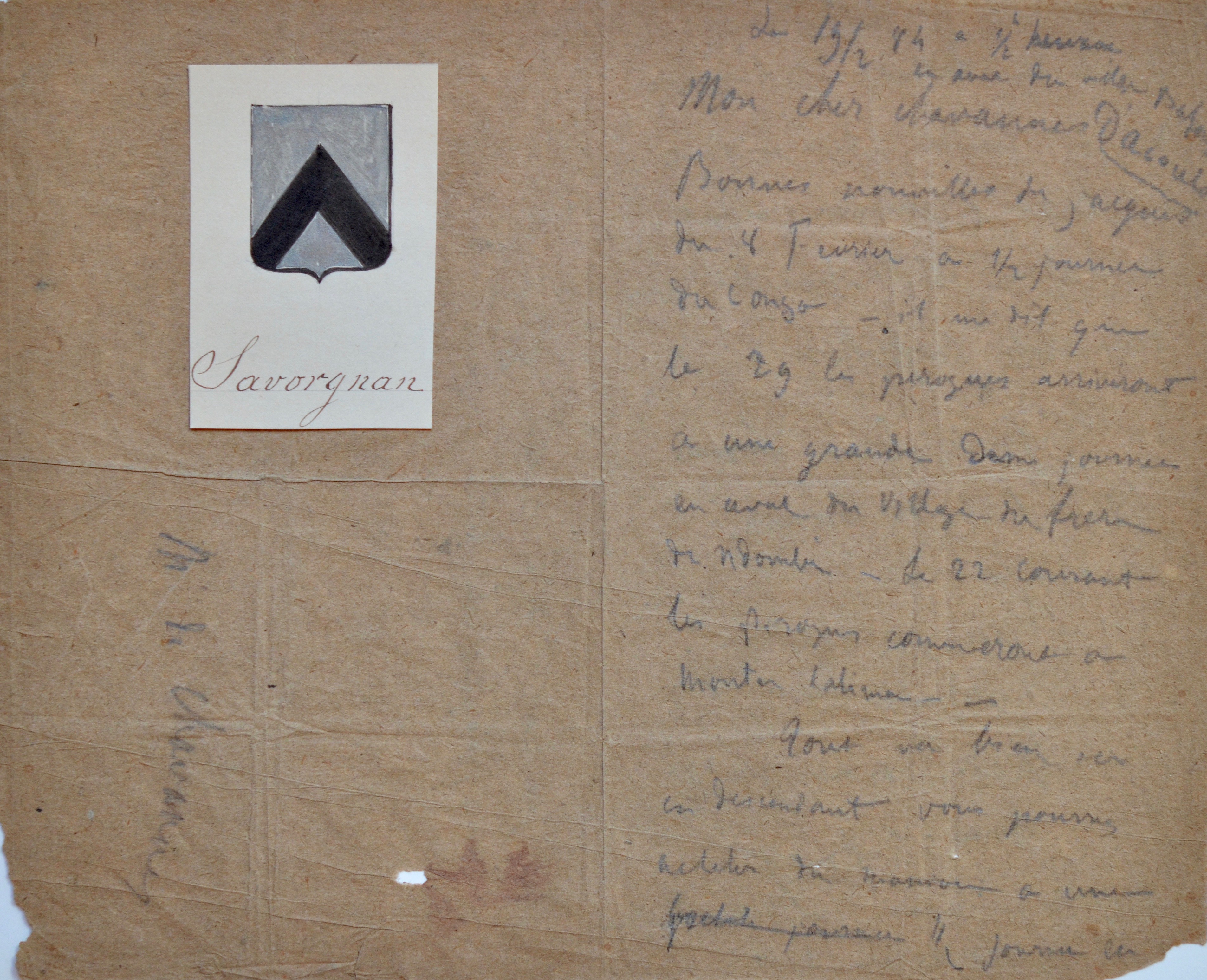 Ecrite au crayon sur un papier brun très rudimentaire. Les armoiries de Savorgnan de Brazzaville dessinées sur papier fort, ont été collées au dos de la lettre.