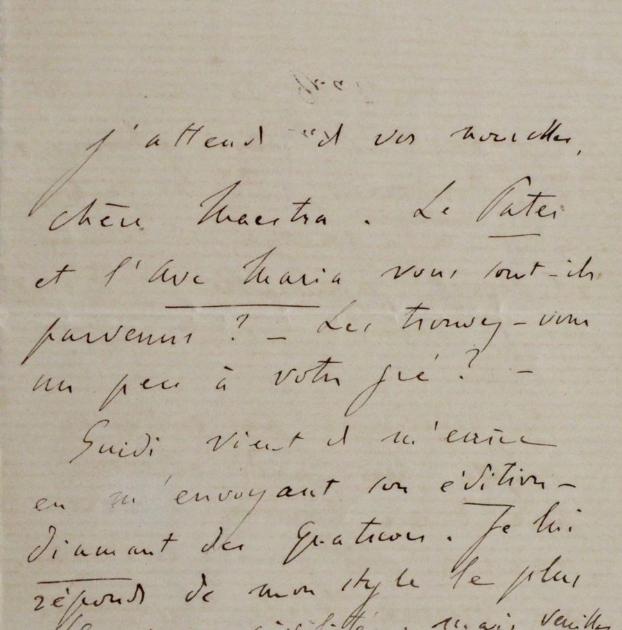 Franz Liszt (Raiding, 1811/1886)"J'attends de vos nouvelles, chère Maestra. Le Pater et l'Ave Maria vous sont-ils parvenus ? Les trouvez-vous un peu à votre gré ? Guidi vient de m’écrire en m’envoyant son édition diamant des Quatuors. Je lui réponds de mon style le plus fleuri en civilités ; mais veuillez avoir la grand [sic] bonté de me mettre de suite tout à fait en règle avec lui en payant 1° mon abonnement d’un an au "Boccherini" 2° les Quatuors qu’il m’a envoyé, si comme il serait supposable, il n’avait pas l’intention de m’en faire cadeau.
