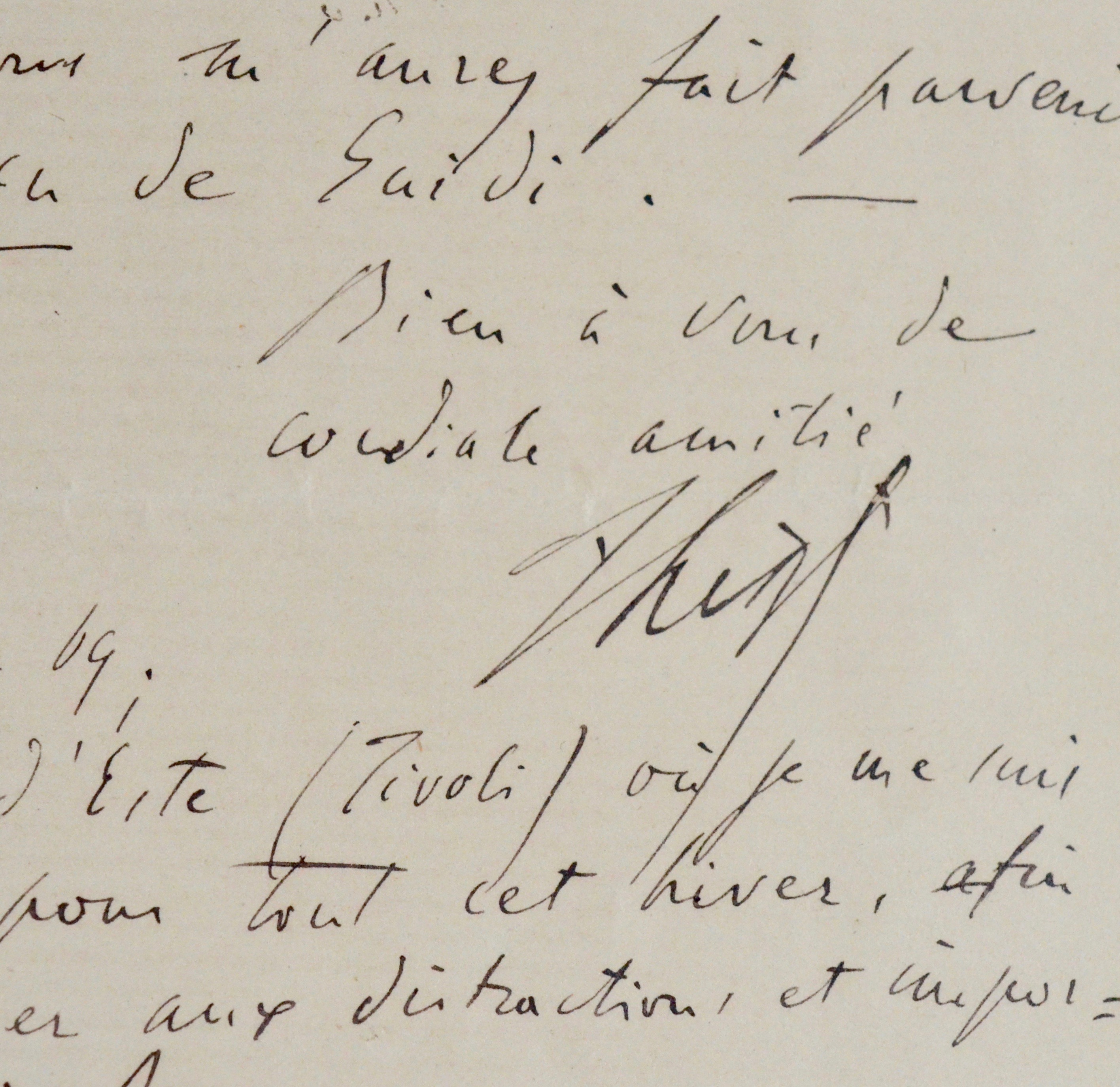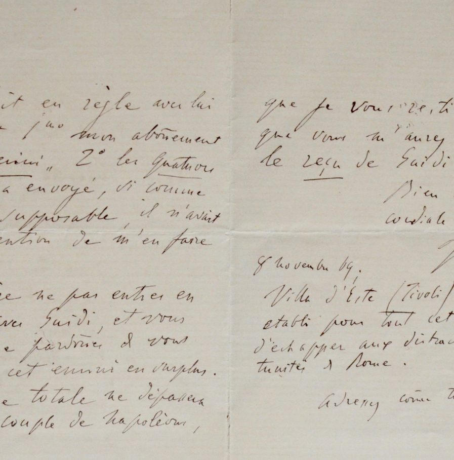 Je préfère ne pas entrer en compte avec Guidi, et vous prie de me pardonner de vous occasionner cet ennui en surplus. La somme totale ne dépassera certainement pas une couple de napoléons, que je vous restituerai aussitôt que vous m’aurez fait parvenir le reçu de Guidi. – Bien à vous de cordiale amitié […]. Villa d’Este (Tivoli) où je me suis établi pour tout cet hiver, afin d’échapper aux distractions, et importunités de Rome. Adressez comme toujours : Rome".