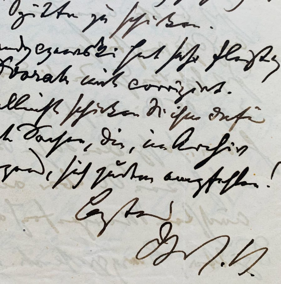 Très belle lettre de Brahms consacrée aux funérailles du chef d'orchestre Hans von Bülow (1830-1894), qui fut, dès le début, un grand admirateur de Brahms, le considérant comme le successeur de Beethoven, allant qualifier sa première symphonie comme étant la "dixième de Beethoven". Signée de ses initiales "J. B.".