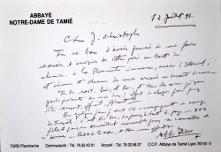 L'Abbé Pierre (Lyon, 1912/2007)Intéressante lettre de l'Abbé Pierre à celui qui se réclamait être son fils, Jean-Christophe Ménétrier, qui publiera un livre à ce sujet "l'Abbé Père" sous le pseudonyme de Jean-Christophe d'Escaut [l'abbé Pierre a toujours démenti cette paternité, et fera même un test ADN, expliquant que les Ménétrier avaient été la première famille à être accueillie par Emmaeüs]. "Tu es bon d'avoir pensé à me faire savoir l'arrivée de votre père au bout du chemin, à la Rencontre immense, avec l'Eternel, et chacun et chacune de ceux arrivés au devant de nous. Tu le sais, lui, et toi, et tous les tiens, je vous garde présents du moins dans l'effort de chaque jour pour être servant, offrant, adorant. Pour quelques jours je suis ici accompagnant ce camp de travail. C'est très bon, des jeunes de tant de pays - 700 filles et garçons travaillant ensemble pour se connaitre et donner [...]".