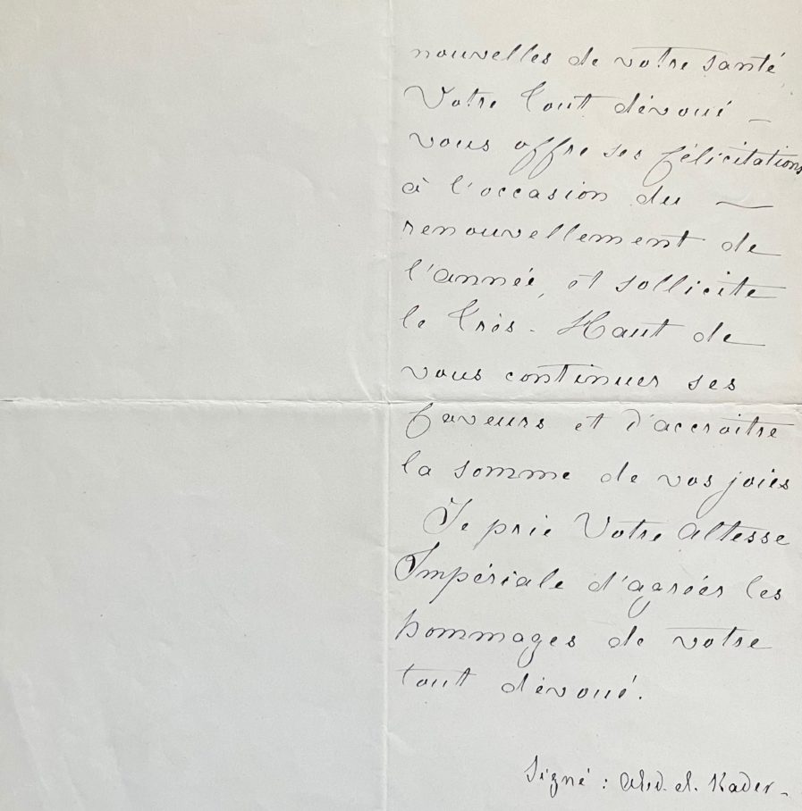 "Louange à Dieu. À la noble, à la vertueuse, à la perle précieusement gardée Madame la Princesse Mathilde que Dieu continue à répandre sur son Altesse Impériale, à jamais ses dons et ses bénédictions. En s'informant des nouvelles de votre santé votre tout dévoué - vous offre ses félicitations à l'occasion du renouvellement de l'année , et sollicite le Très-Haut de vous continuer ses faveurs et d'accroitre la somme de vos joies [...]".