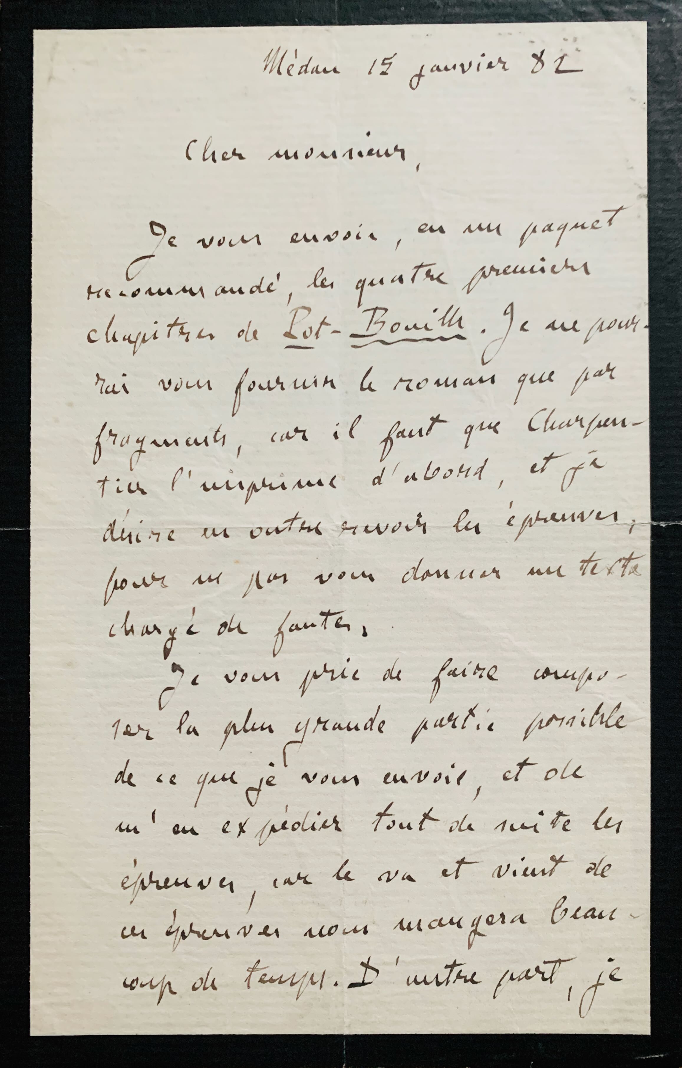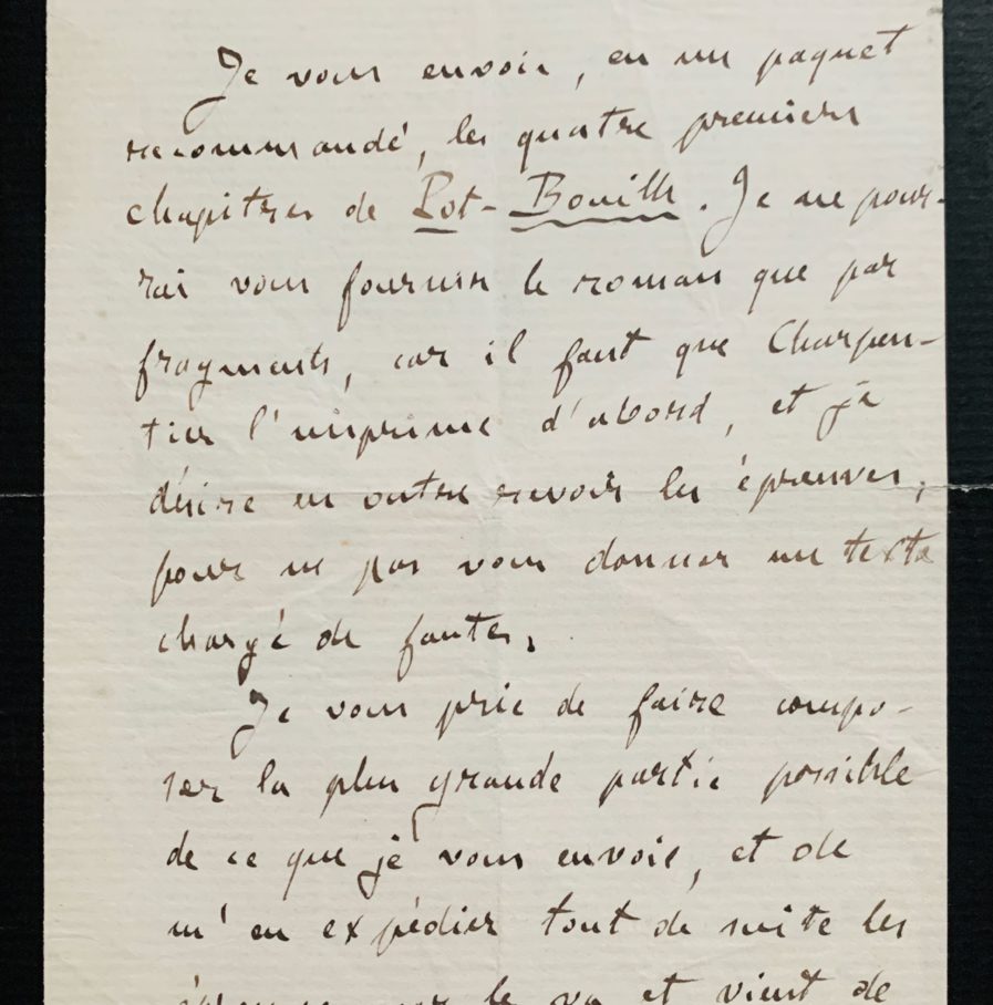 "Je vous envoie, en un paquet recommandé, les quatre premiers chapitres de Pot-Bouille. Je ne pourrai vous fournir le roman que par fragments, car il faut que Charpentier l'imprime d'abord, et je désire en outre revoir les épreuves, pour ne pas vous donner un texte chargé de fautes.