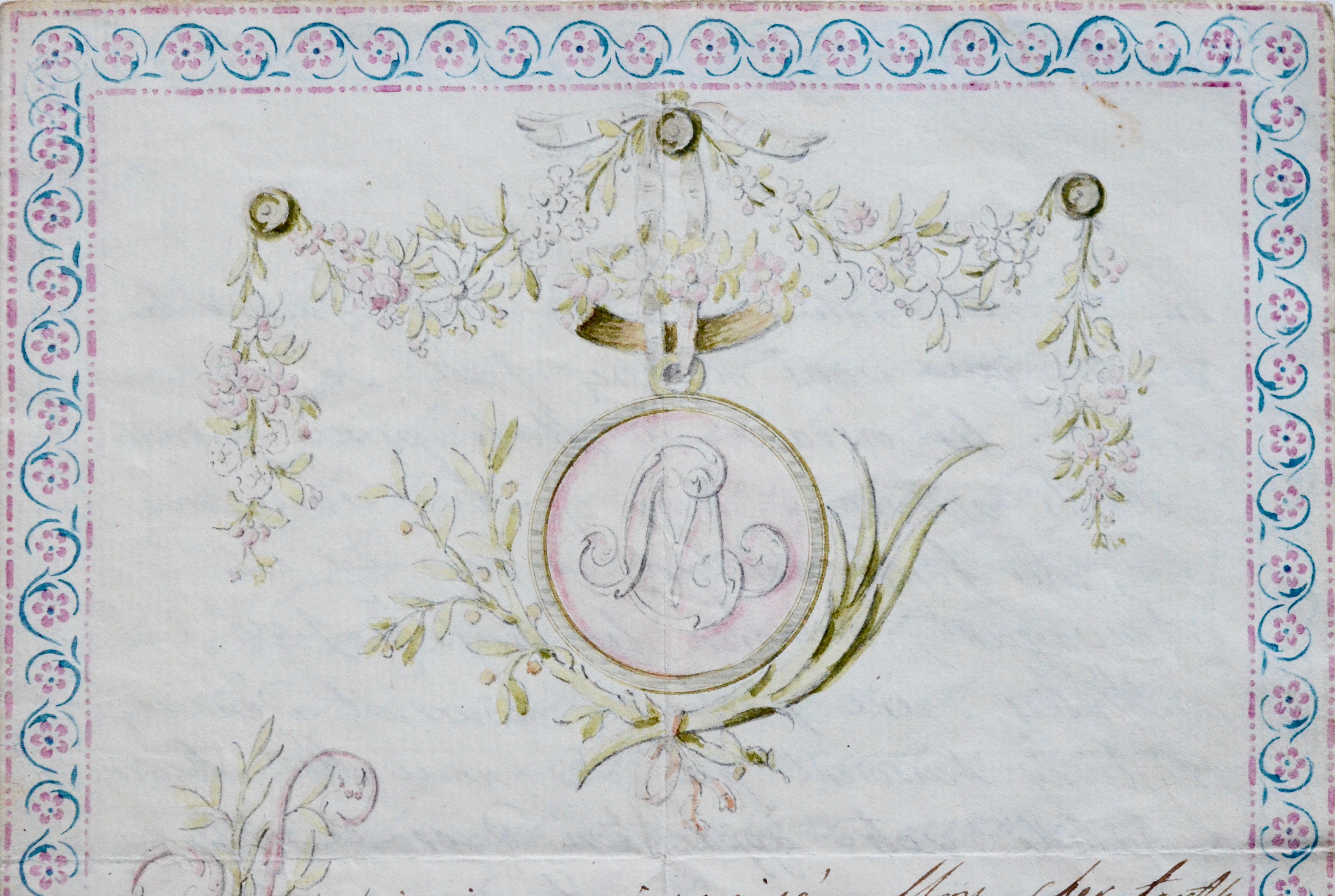 Très beau papier à lettre avec encadrement au pochoir formé de chaînettes roses encadrant un semis de fleurs roses et bleues. En-tête formé d'une guirlandes de fleurs et noeuds retenant un médaillon orné du chiffre CM, dessiné au crayon à papier avec rehaut d'aquarelle vert et rose. Lettrine identique.