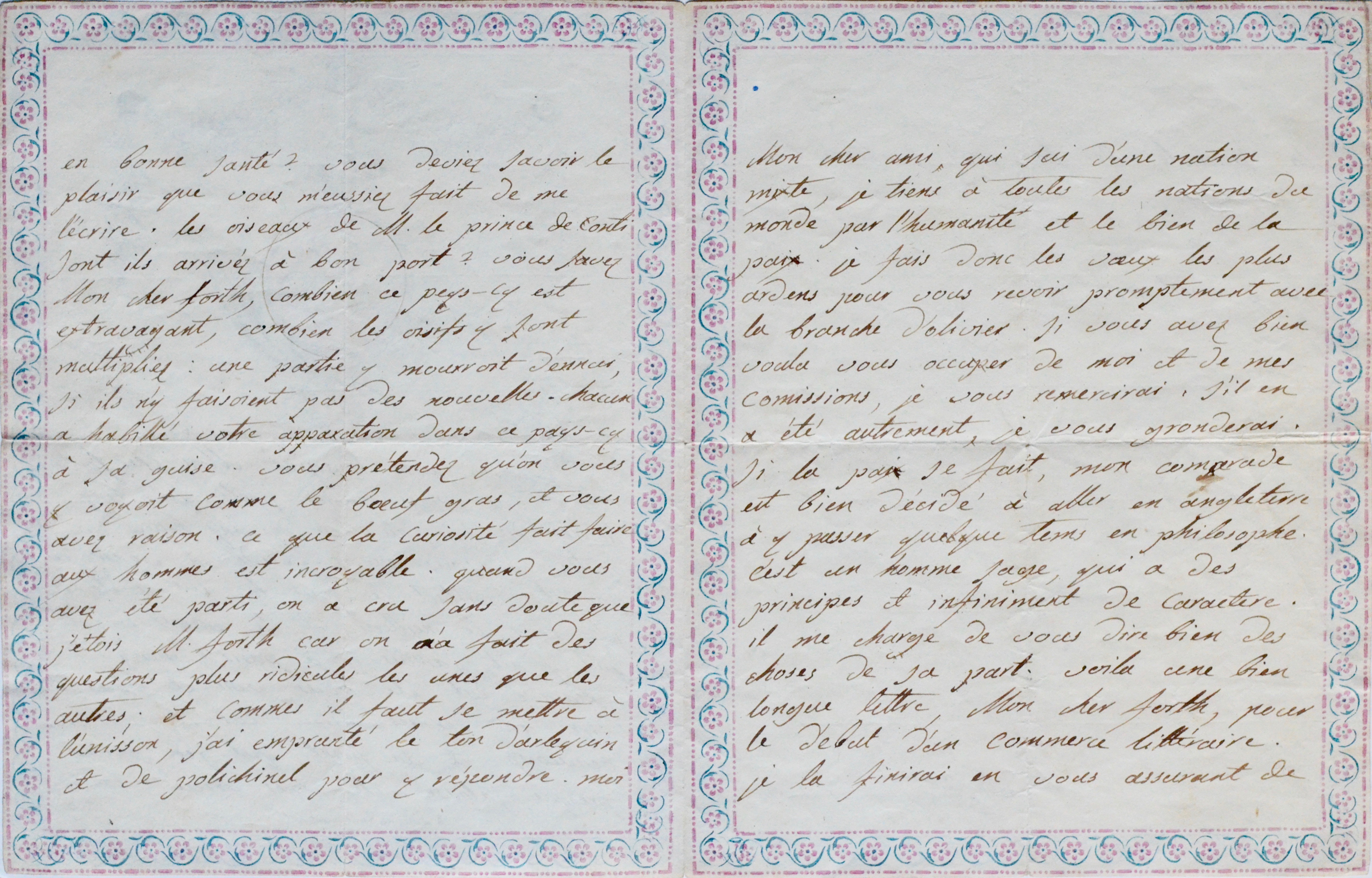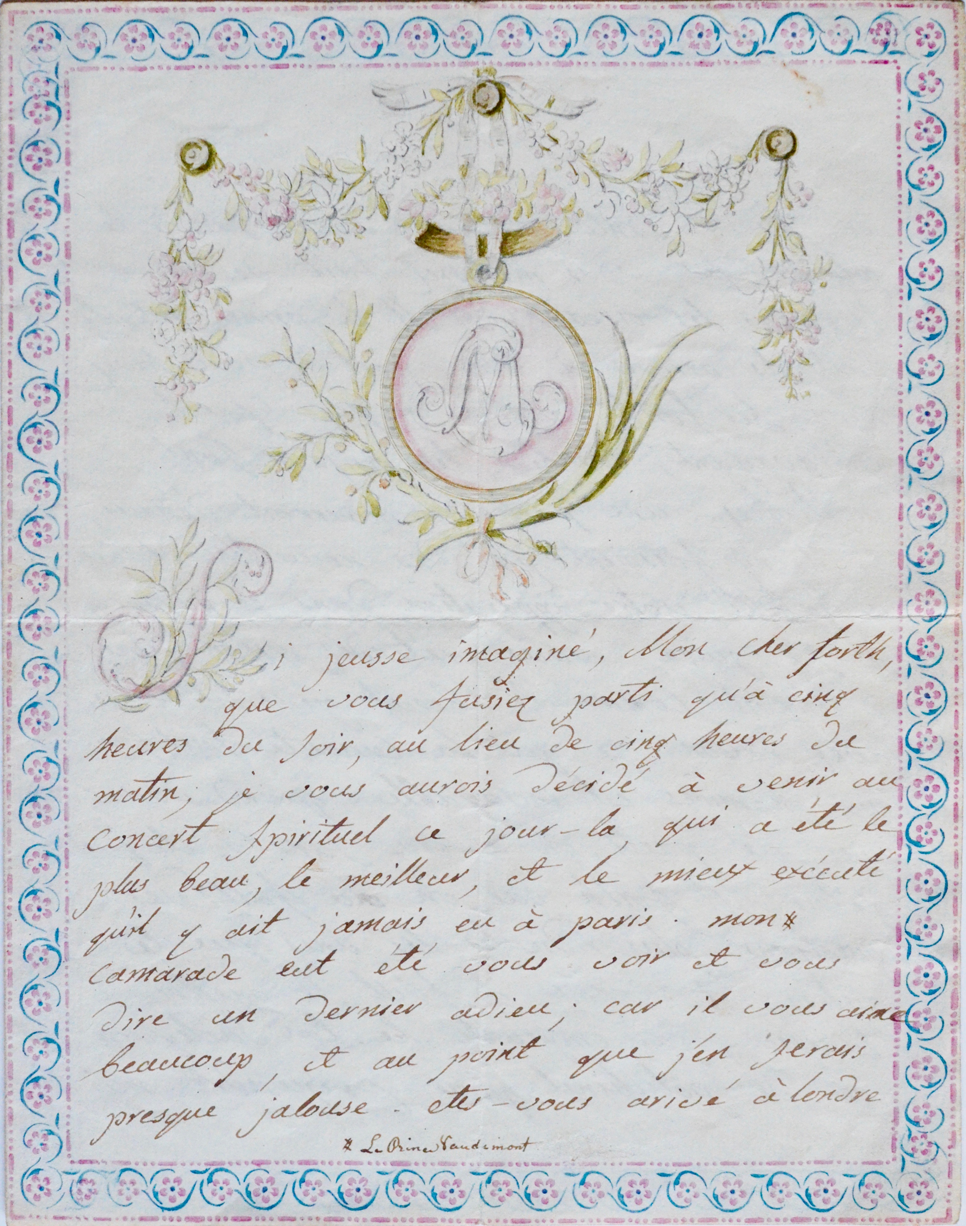 "Si jeusse imaginé, Mon cher Forth, que vous fusiez parti qu'à cinq heures du soir, au lieu de cinq heures du matin, je vous aurais décidé à venir au concert spirituel ce jour-là, qui a été le plus beau, me meilleur, et le mieux exécuté qu'il y ait jamais eu à Paris. Mon *(Le Prince de Vaudemont) camarade eut été [mot oublié] vous voir et vous dire un dernier adieu ; car il vous aime beaucoup, et au point que j'en serais presque jalouse. Etes-vous arrivé à Londre [sic] en bonne santé ? Vous devriez savoir le plaisir que vous m'eussiez fait de me l'écrire. Les oiseaux de M. le prince de Conti sont-ils arrivés à bon port ? Vous savez mon cher Forth, combien ce pays-cy est extravagant, combien les oisifs y sont multiplies : une partie y mourroit d'ennui, si ils n'y faisoient pas des nouvelles - chacune habillé votre apparition dans ce pays-cy à sa guise. Vous prétendez qu'on vous y voyoit comme le boeuf gras, et vous avez raison. Ce que la curiosité fait faire aux hommes est incroyable. Quand vous avez été parti, on a cru sans doute que j'étois M. Forth car on n'a fait des questions plus ridicules les unes que les autres ; et commes il faut se mettre à l'unisson, j'ai emprunté le ton d'arlequin et de polichinelle pour y répondre. Moi, Mon cher ami, qui sui [sic] d'une nation mixte, je tiens à toutes les nations du monde par humanité et le bien de la paix [...]". Elle souhaite le revoir rapidement et le grondera si il ne s'est pas occupé de ses commissions. Elle ajoute à propos de Vaudemont "Si la paix se fait, mon camarade est bien décidé à aller en Angleterre à y passer quelques tems en philosophe [...]". Elle termine son courrier par ces mots affectueux "Voilà une bien longue lettre, Mon cher Forth, pour le début d'un commerce littéraire. Je la finirai en vous assurant de la sincérité de tous mes sentiment".
