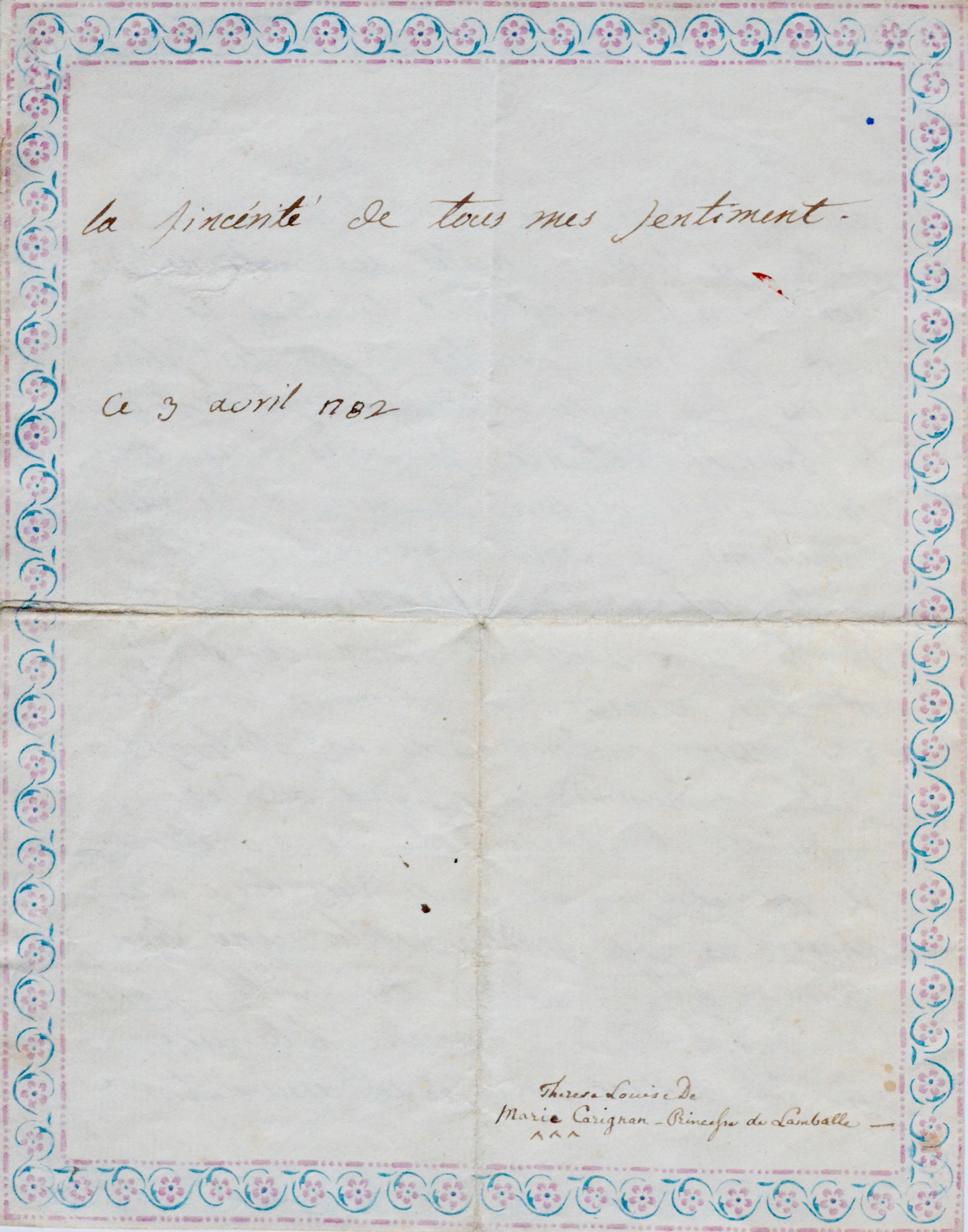 Ce courrier est décrit dans l'ouvrage de François Adolphe Mathurin de Lescure : La princesse de Lamballe, sa vie - sa mort (Paris, Henri Plon, 1864), dans les termes suivants :