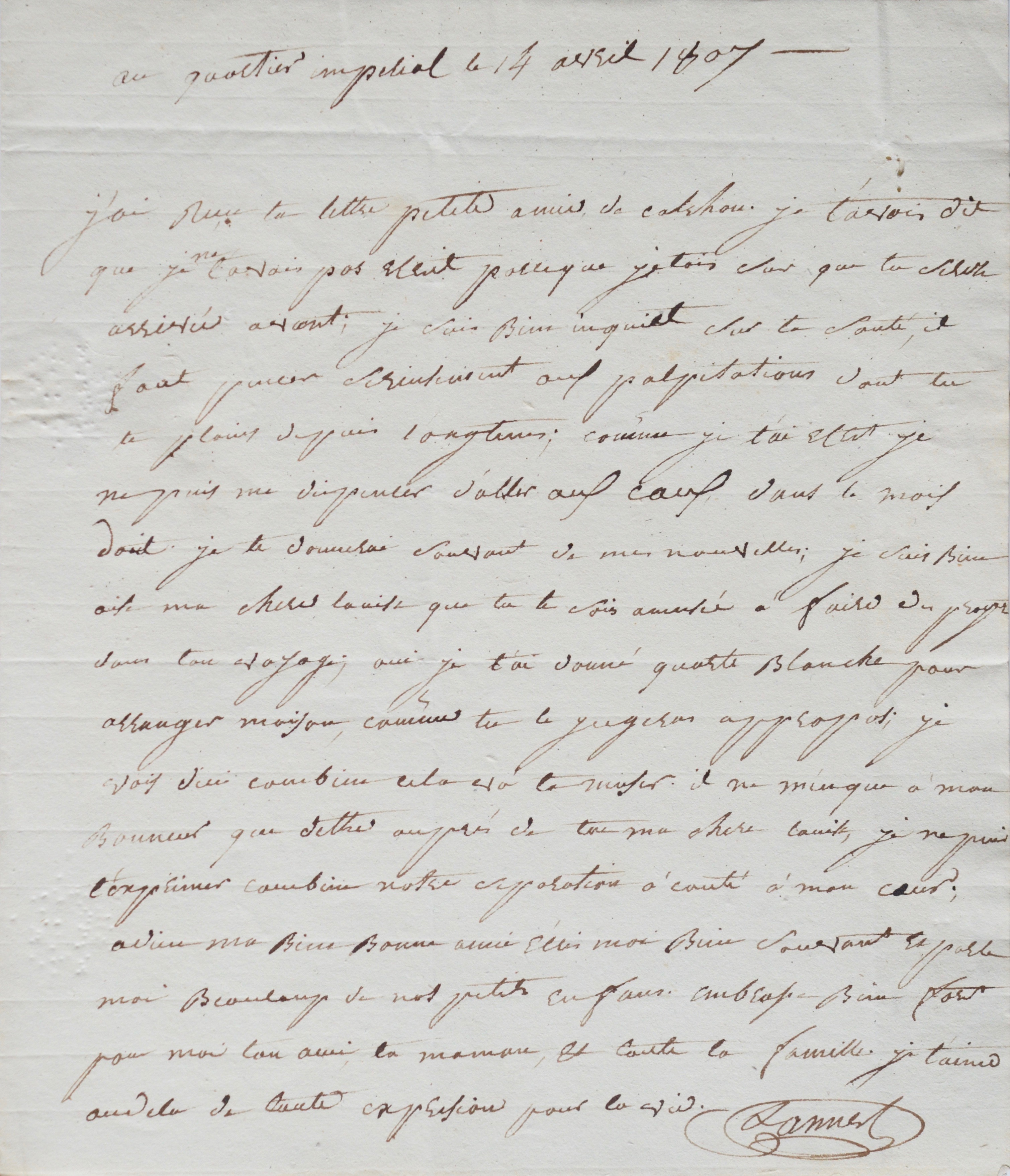"J’ai reçu ta lettre, petite amie, de Calrhou [Karlsruhe]. Je t'avais dit que je ne l'avais pas ecrit parce que j'etais sur que tu ne serait arrivée avant ; Je suis bien inquiet sur ta santé, il faut pencer sérieusement aux palpitations dont tu te plains depuis longtems, comme je t’ai écrit, je ne puis me dispenser d’aller aux eaux dans le mois dout. Je te donnerai souvent de mes nouvelles ; Je suis bien aise ma chère Louise que tu te sois amusée à faire du progrès dans ton voyage ; oui, je t’ai donné quarte blanche pour arranger maison comme tu jugeras appropos [leur château de Maisons], je vois d’ici combien cela va t’amuser. Il ne menque à mon bonneur que d’ettre auprès de toi ma chère Louise, je ne puis t’exprimer combien notre séparation a coûté à mon coeur. Adieu ma bien bonne amie. Écris moi bien souvent et parle moi beaucoup de nos petits enfants. Embrasse bien fort pour moi ton ami, ta maman, et toute la famille. Je t’aime au-delà de toute expression pour la vie [...]".