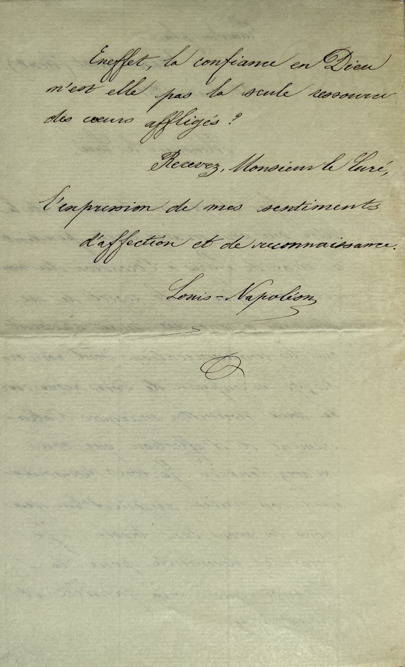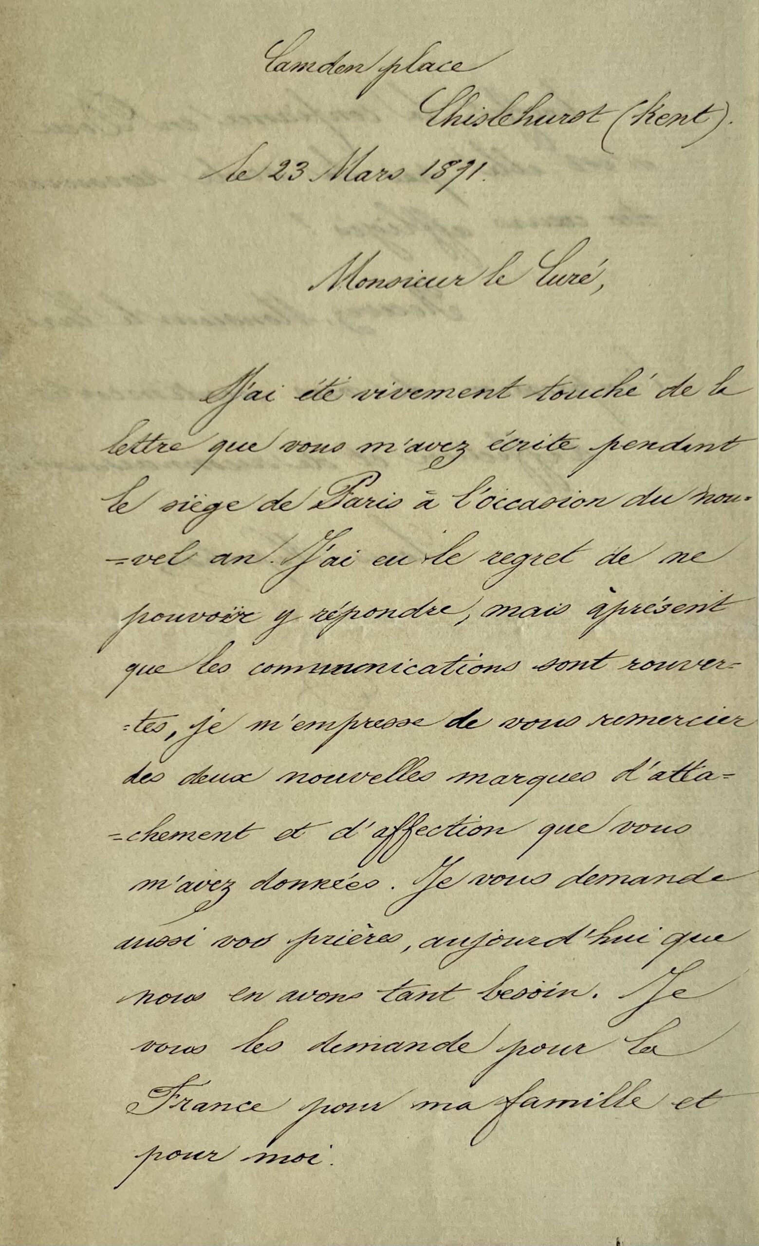 "J'ai été vivement touché de la lettre que vous m'avez écrite pendant le siège de Paris à l'occasion du nouvel an. J'ai eu le regret de ne pouvoir y répondre, mais à présent que les communications sont rouvertes, je m'empresse de vous remercier des deux nouvelles marques d'attachement et d'affection que vous m'avez données. Je vous demande aussi vos prières, aujourd'hui que nous en avons tant besoin. Je vous les demande pour la France pour ma famille et pour moi. En effet, la confiance en Dieu n'est-elle pas la seule ressource des cœurs affligés ? [...]".
