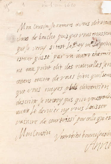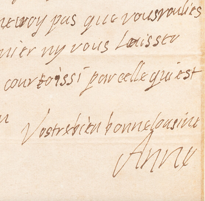 "Mon Cousin je remets à vous dire touttes choses de bouche puisque vous masseures que je veray si tost le Roy, Mr. le prince estant passé par un autre chemin ne ma point dit des nouvelles. Jen attens encore de vous bien quil semble que vous nayes plus dintention descrire. Je ne croy pas que vous voulies avoir le dernier ny vous laisser vaincre de courtoisie par celle qui est, mon cousin, votre bien bonne cousine Anne".