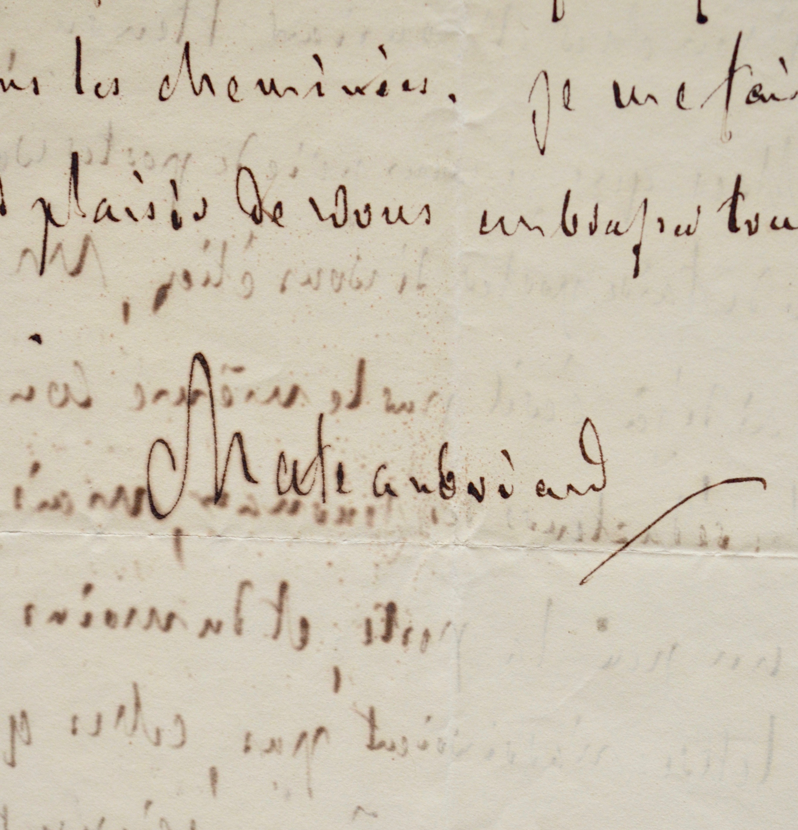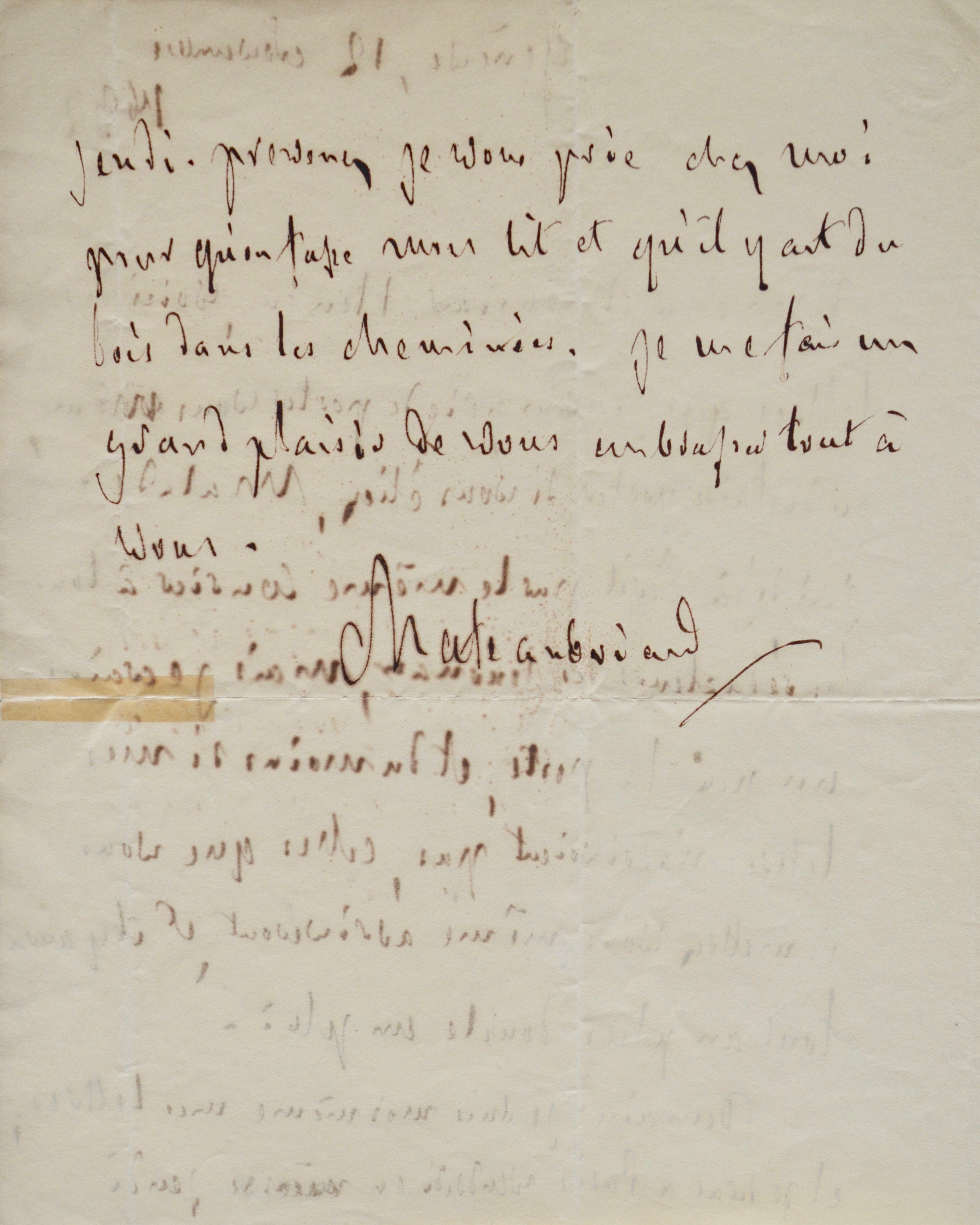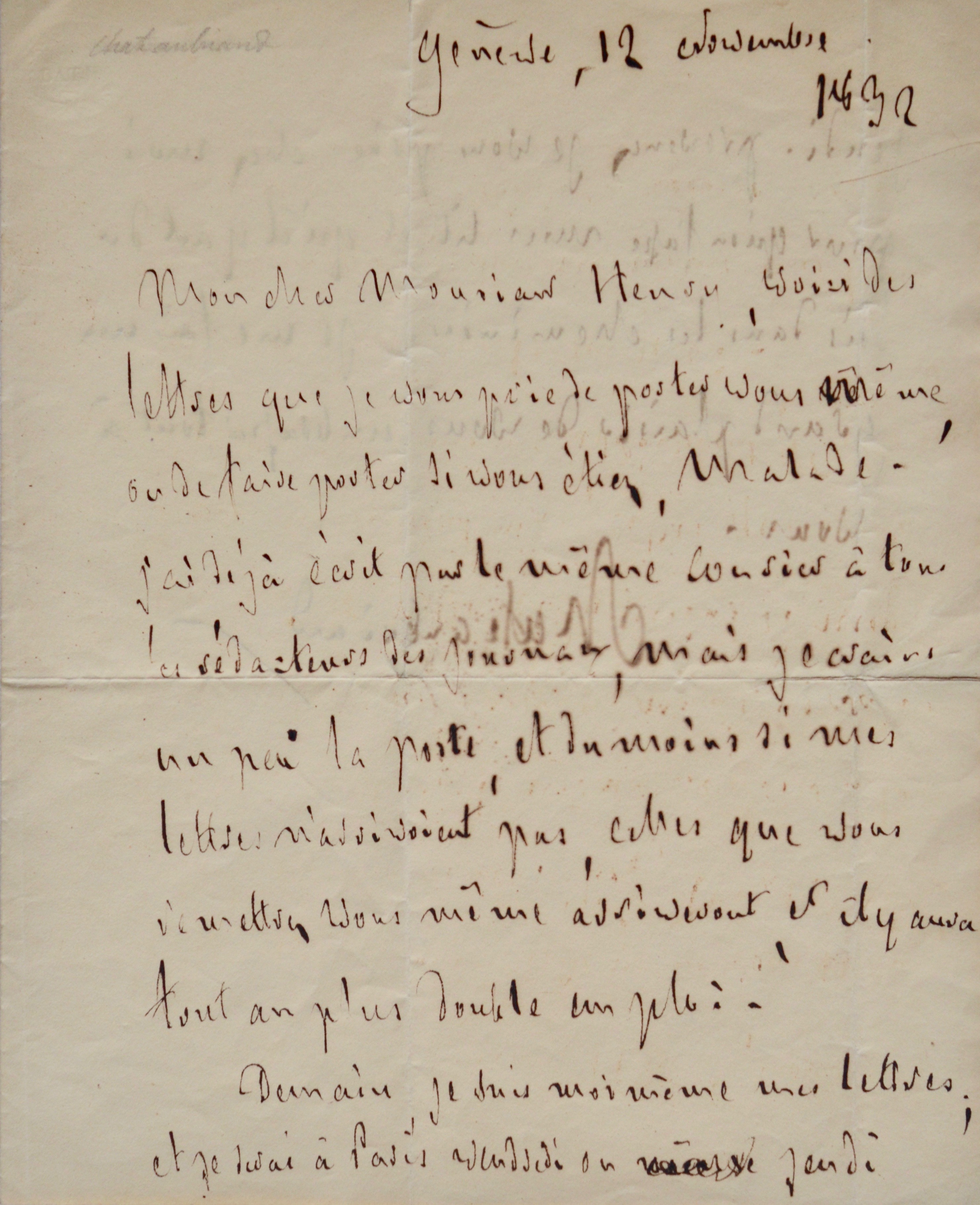 "Mon cher monsieur Henry, voici des lettres que je vous prie de poster vous-même, ou de faire porter si vous étiez malade. J'ai déjà écrit par le même courrier à tous les rédacteurs des journaux, mais je crains un peu la poste, et du moins si mes lettres n'arrivoient pas, celles que vous remettrez vous-même arriveront et il y aura tout au plus double emploi. [...] Je serai à Paris vendredi ou jeudi. Prévenez, je vous prie chez moi pour qu'on fasse mon lit et qu'il y ait du bois dans les cheminées. Je me fais un grand plaisir de vous embrasser. Tout à vous. Chateaubriand".