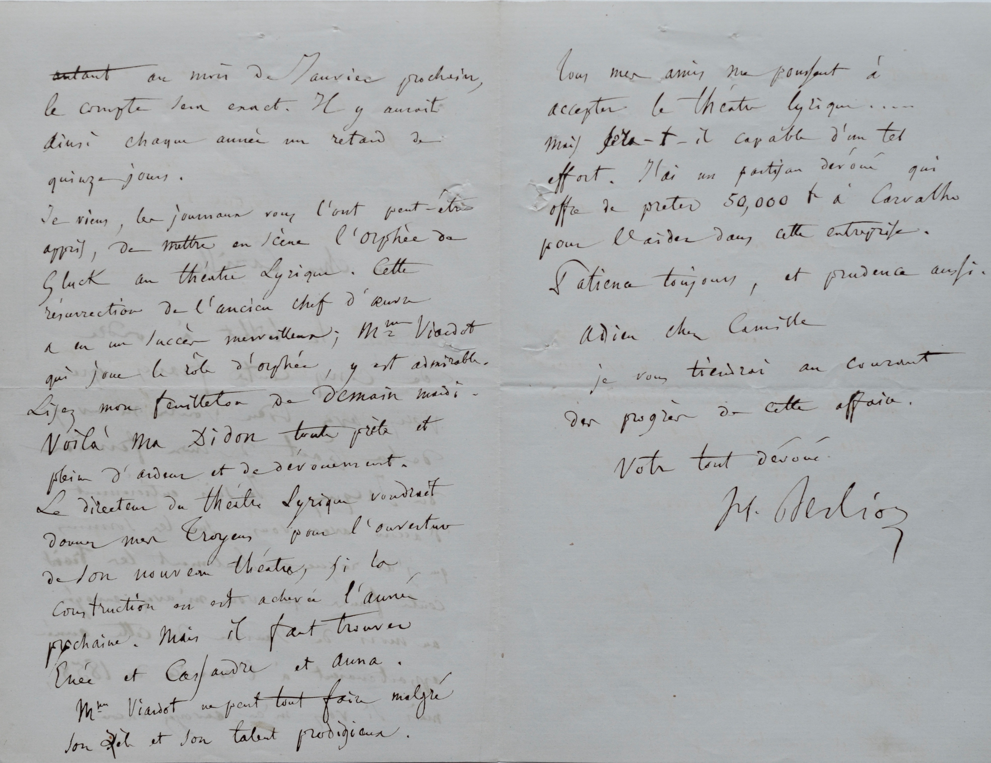 Le directeur du Théâtre Lyrique voudrait donner mes Troyens pour l'ouverture de son nouveau théâtre, si la construction en est achevée l'année prochaine. Mais il faut trouver Enée et Cassandre et Anna. Mme Viardot ne peut tout faire malgré son zèle et son talent prodigieux. Tous mes amis me poussent à accepter le Théâtre lyrique...... Mais sera-t-il capable d'un tel effort. J'ai un partisan dévoué qui offre de prêter 50,000 fr. à Carvalho pour l'aider dans cette entreprise. Patience toujours, et prudence aussi [...] ». [Les Troyens, avec ses 4 heures et son imposant orchestre, connut de grosses difficultés pour être monté : l'opéra fut divisé en deux parties inégales ; seule la seconde partie sera représentée lors de la création le 4 novembre 1863 au Théâtre Lyrique, seule partie que Berlioz verra de son vivant].