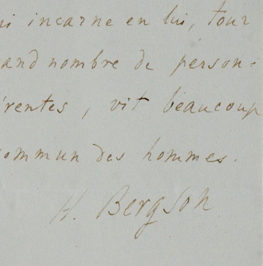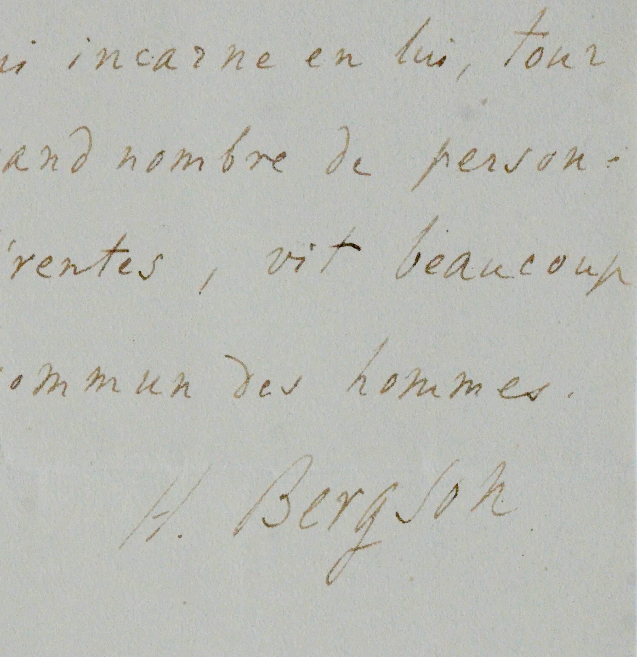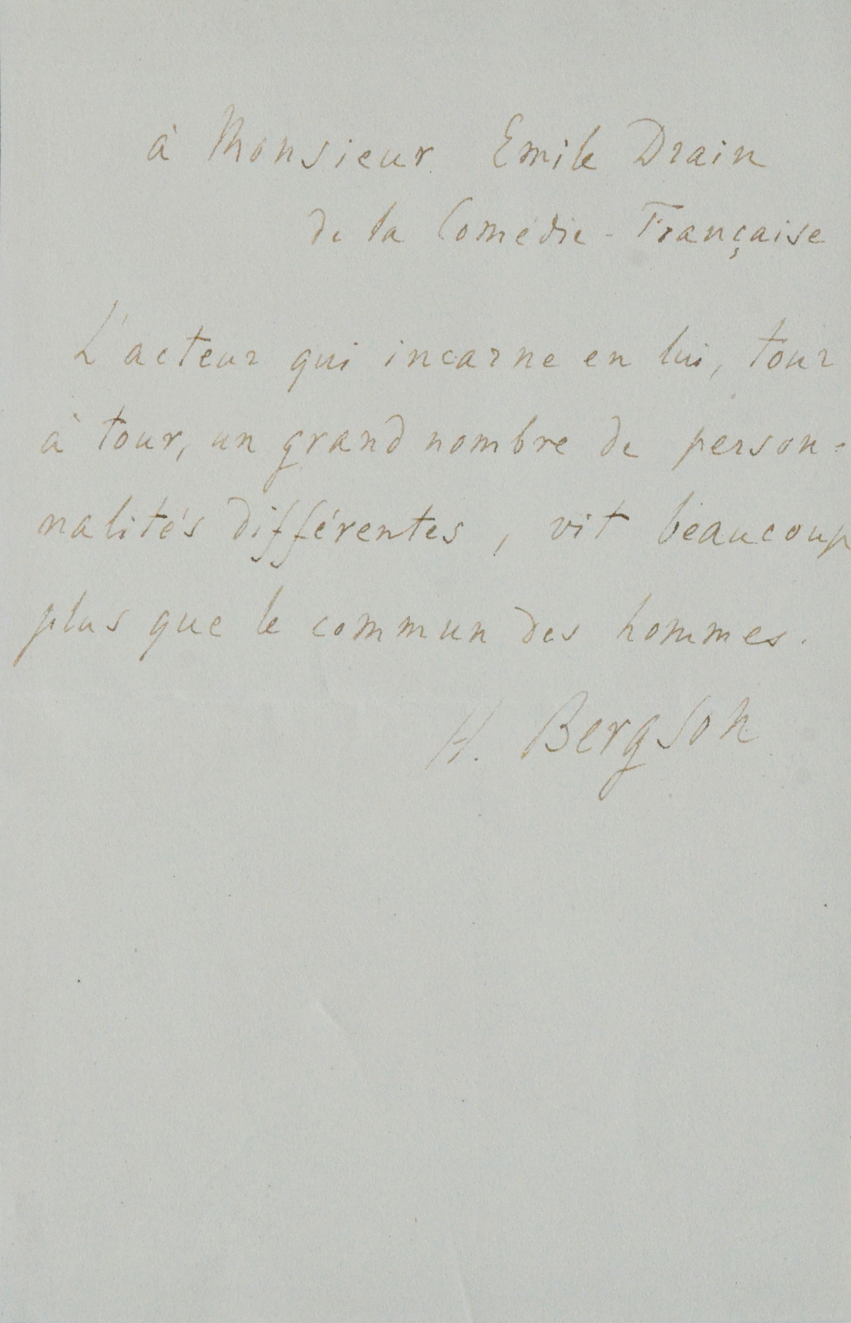Belle pensée d'Henri Bergson, sur le métier d'acteur, dédiée à Émile Drain, pensionnaire de la Comédie française :