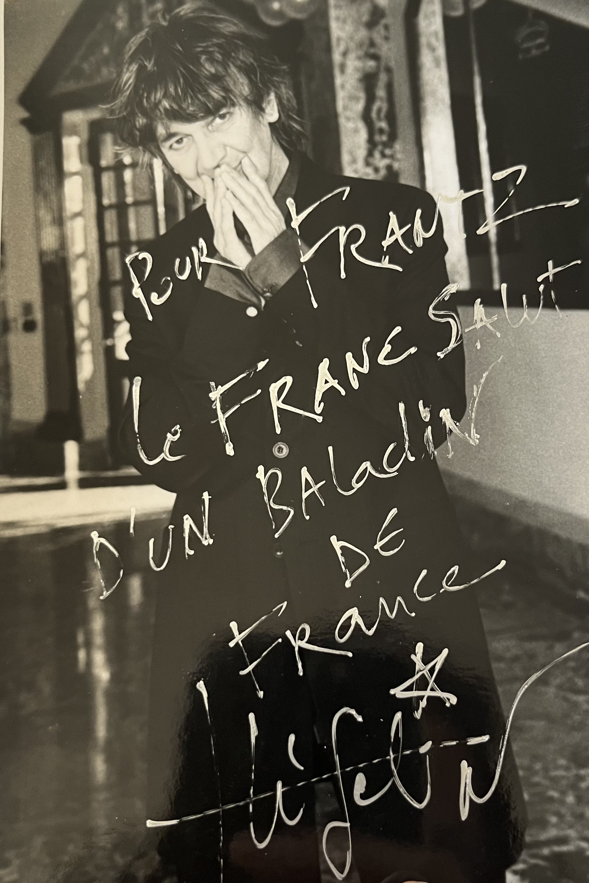 Jolie dédicace au feutre argenté, jouant sur les mots : "Pour Frantz. Le Franc salut d'un baladin de France". Signature "Higelin" surmontée d'une étoile.