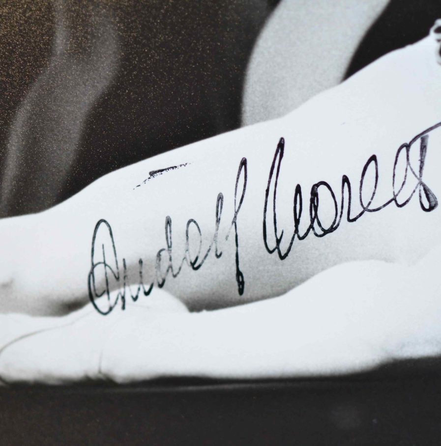Belle photographie de Noureev (cliché Rodolphe Torette, cachet au dos), portant sa signature (griffe ou tampon). Avec une lettre d'envoi du secrétaire de Noureev.