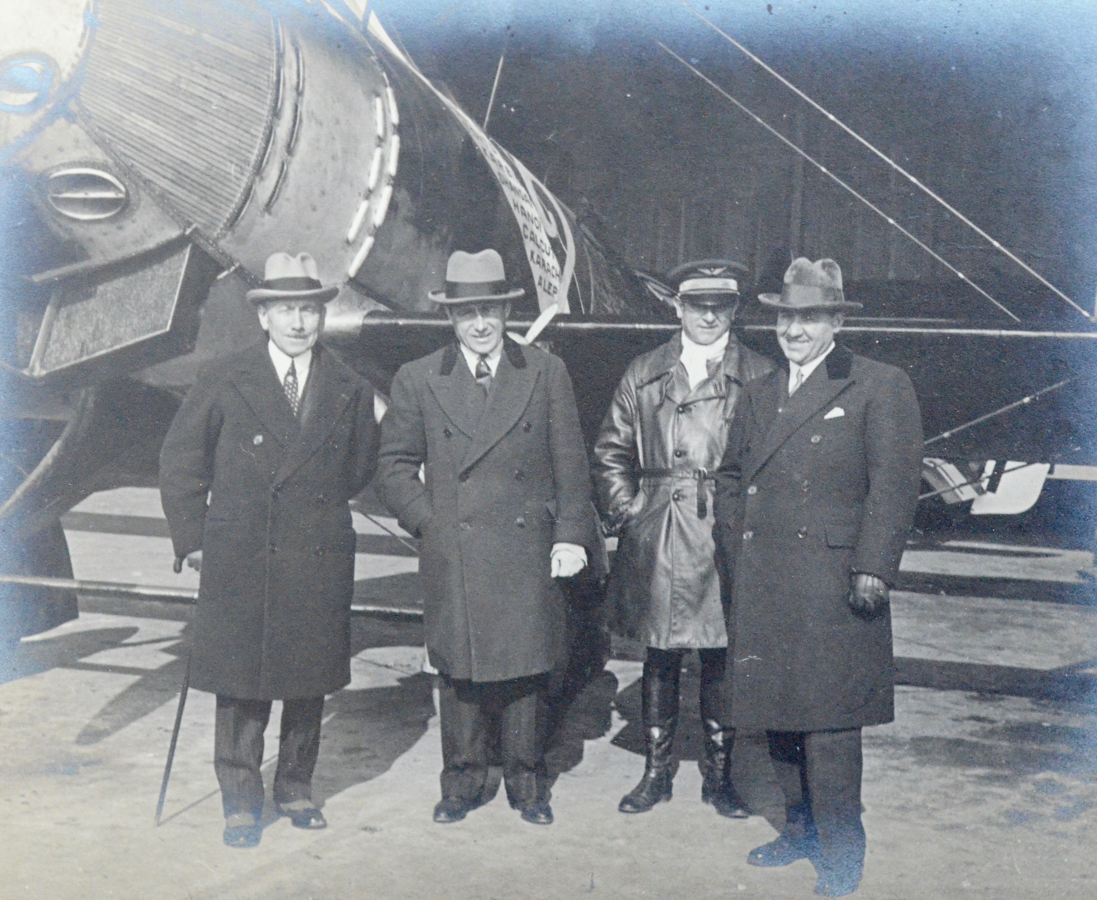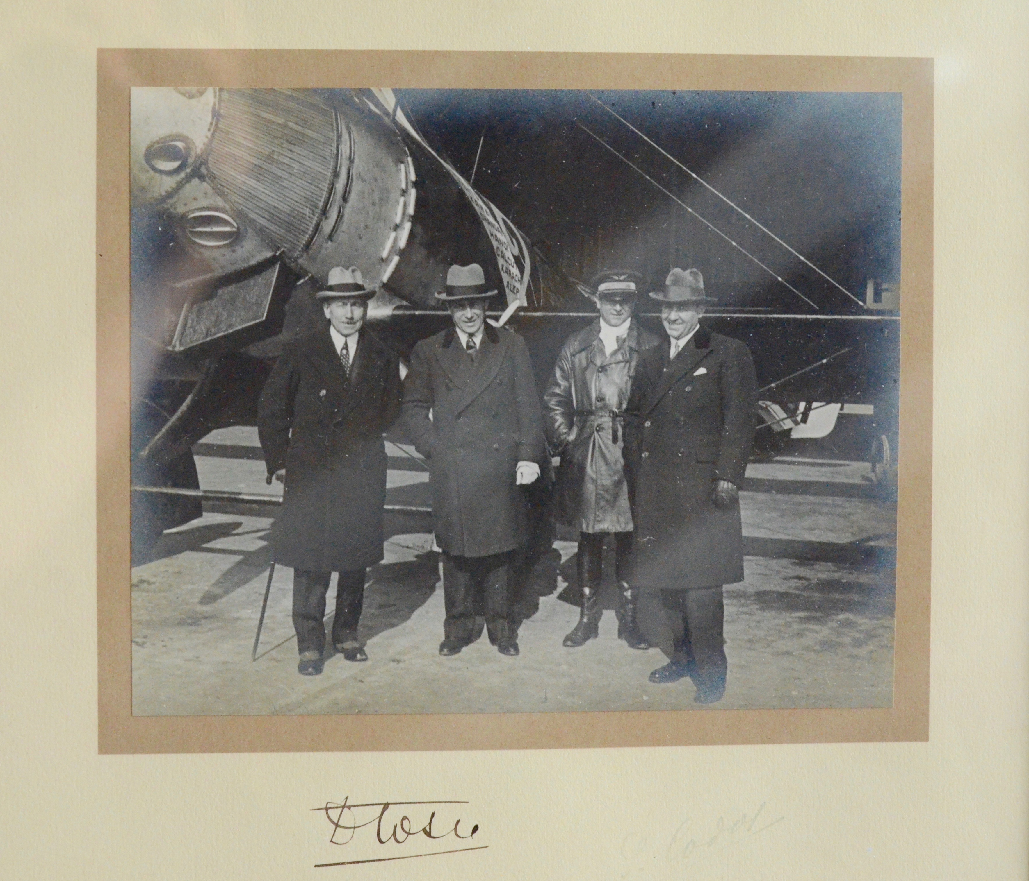 Dieudonné Costes (Septfonds (Tarn-et-Garonne), 1892/1973)Belle et rare photographie argentique d'époque représentant Dieudonné Costes et Paul Codos ainsi que deux autre hommes [très probablement Maurice Bellonte], devant un avion, nommé facétieusement "?" [Point d'interrogation]. Le cliché est contrecollé sur papier fort et sur carton.