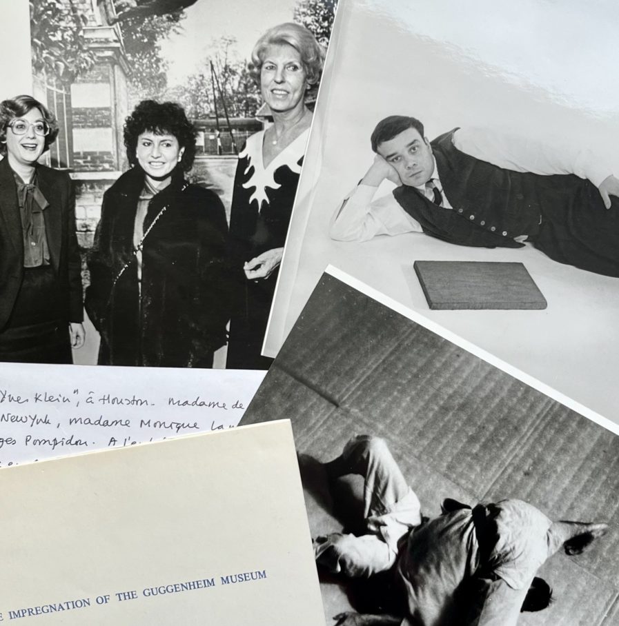 - Exposition Yves Klein à Houston. Photographie originale en noir et blanc. 15,5 x 19 cm, collée sur un feuillet A4. Légende de la main de Jean-Yves Mock : « Vernissage «Yves Klein», à Houston. Madame de Ménil, le maire de New York, madame Monique Lang et madame Georges Pompidou. A l'entrée de cette rétrospective, conçue et mise en place par madame de Ménil, comme «un bouquet», la photo où Klein lévite/plonge, vie en amorce. Émouvant ».
