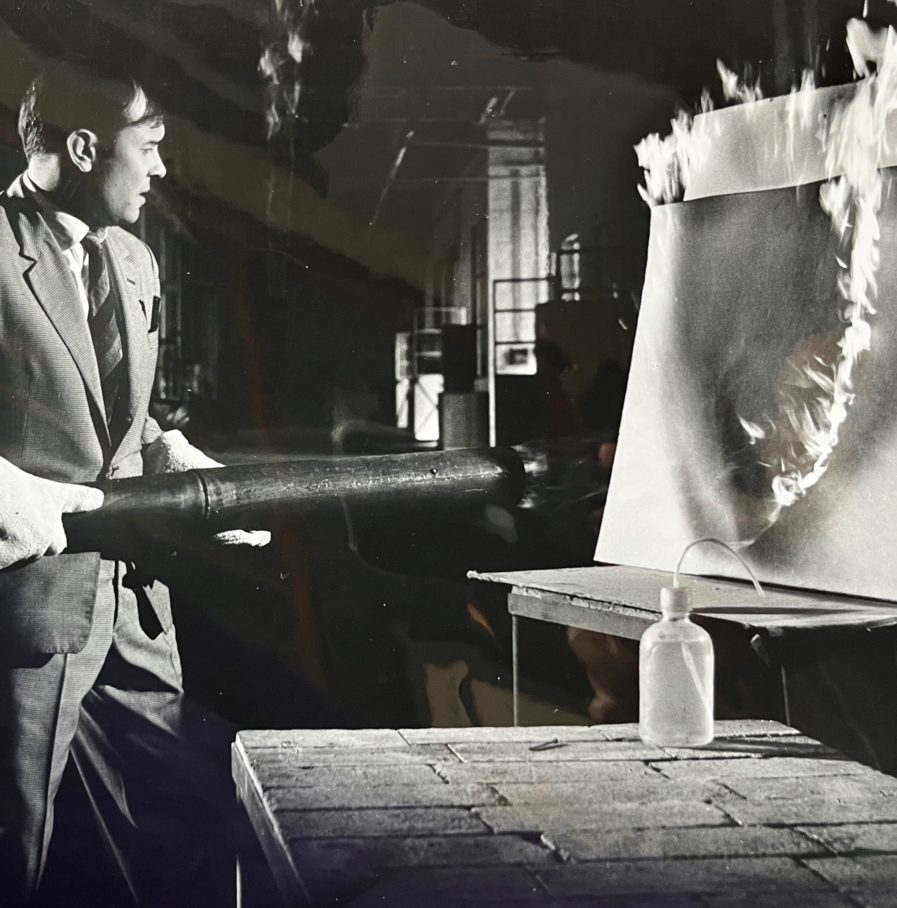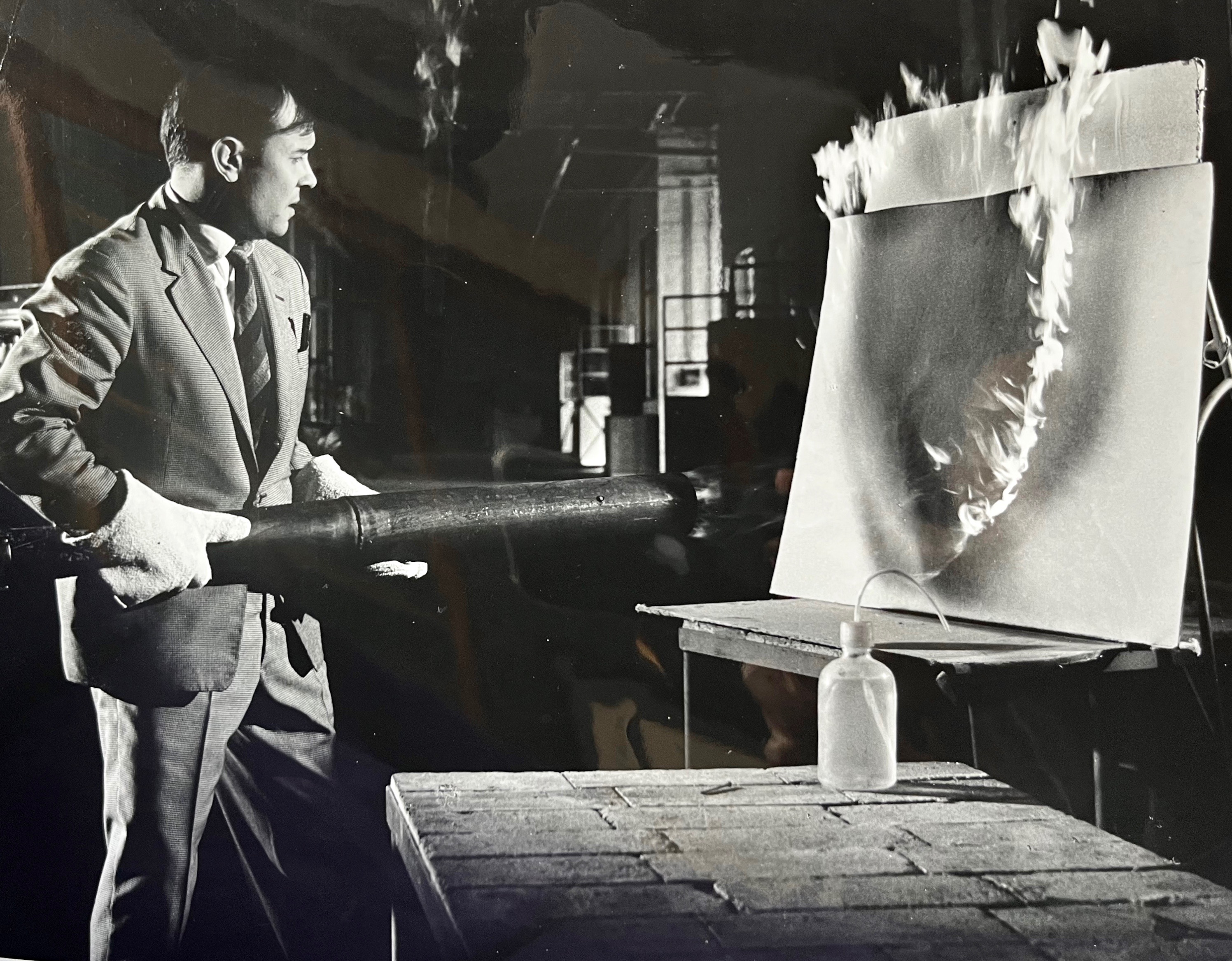 Belle photographie d’Yves Klein réalisant une peinture de feu