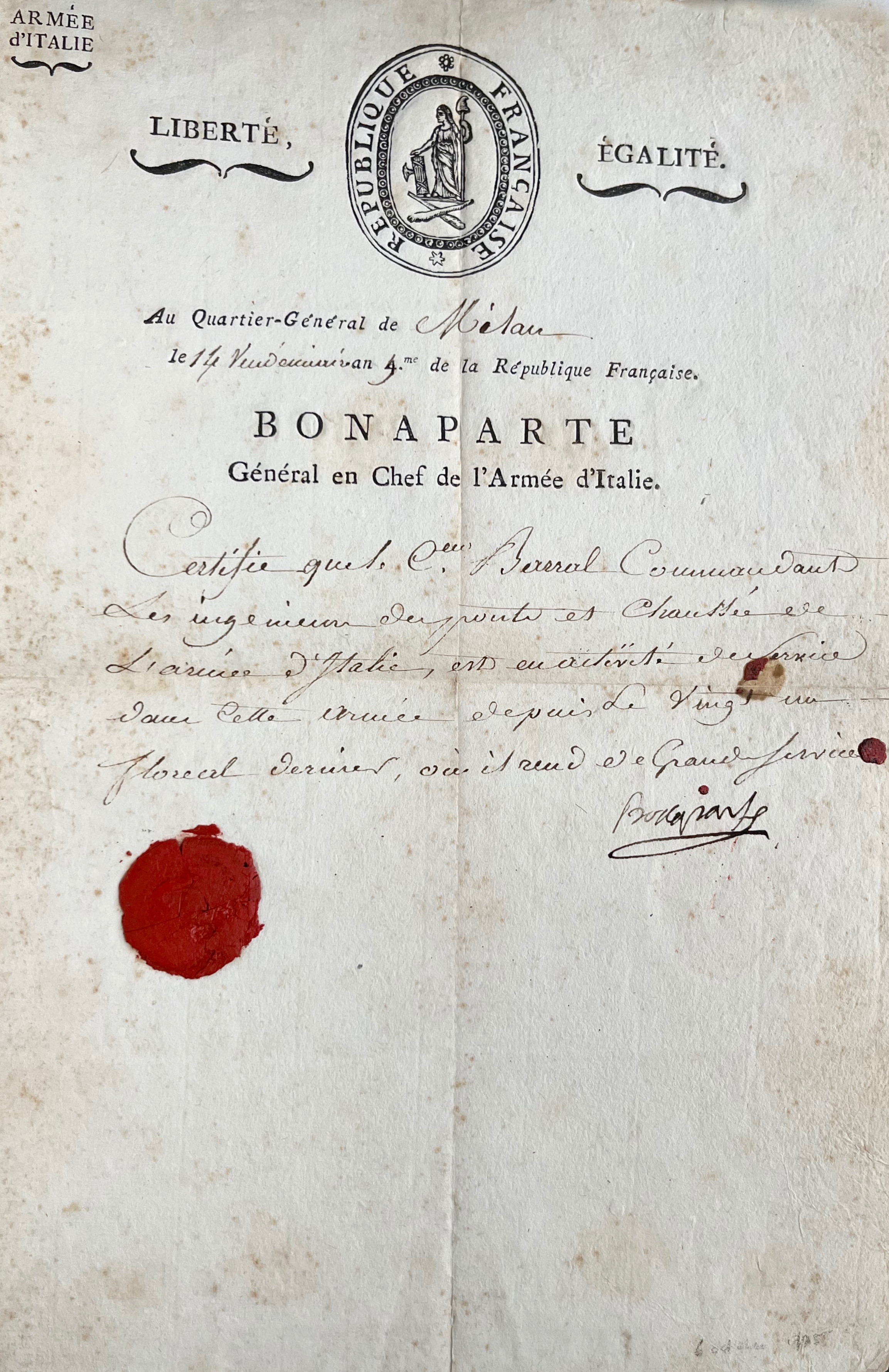 Il certifie que le citoyen Pierre Barral "commandant les ingénieurs des Ponts et chaussées de l'armée d'Italie, est en activité de service dans cette armée depuis le vingt un floréal dernier, où il rend de grands services".