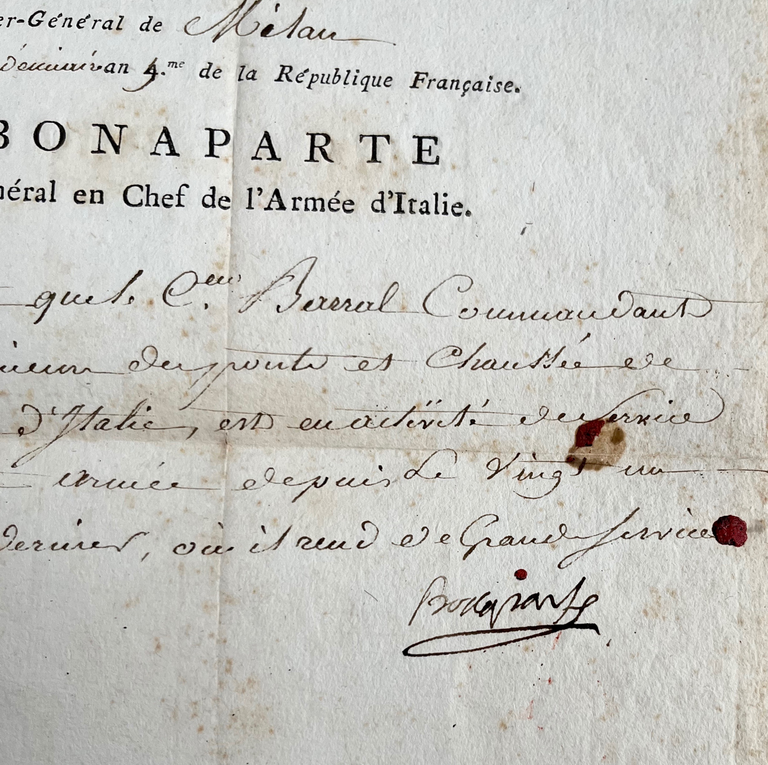 Très belle pièce signée par Bonaparte, comme général en chef de l'armée d'Italie.