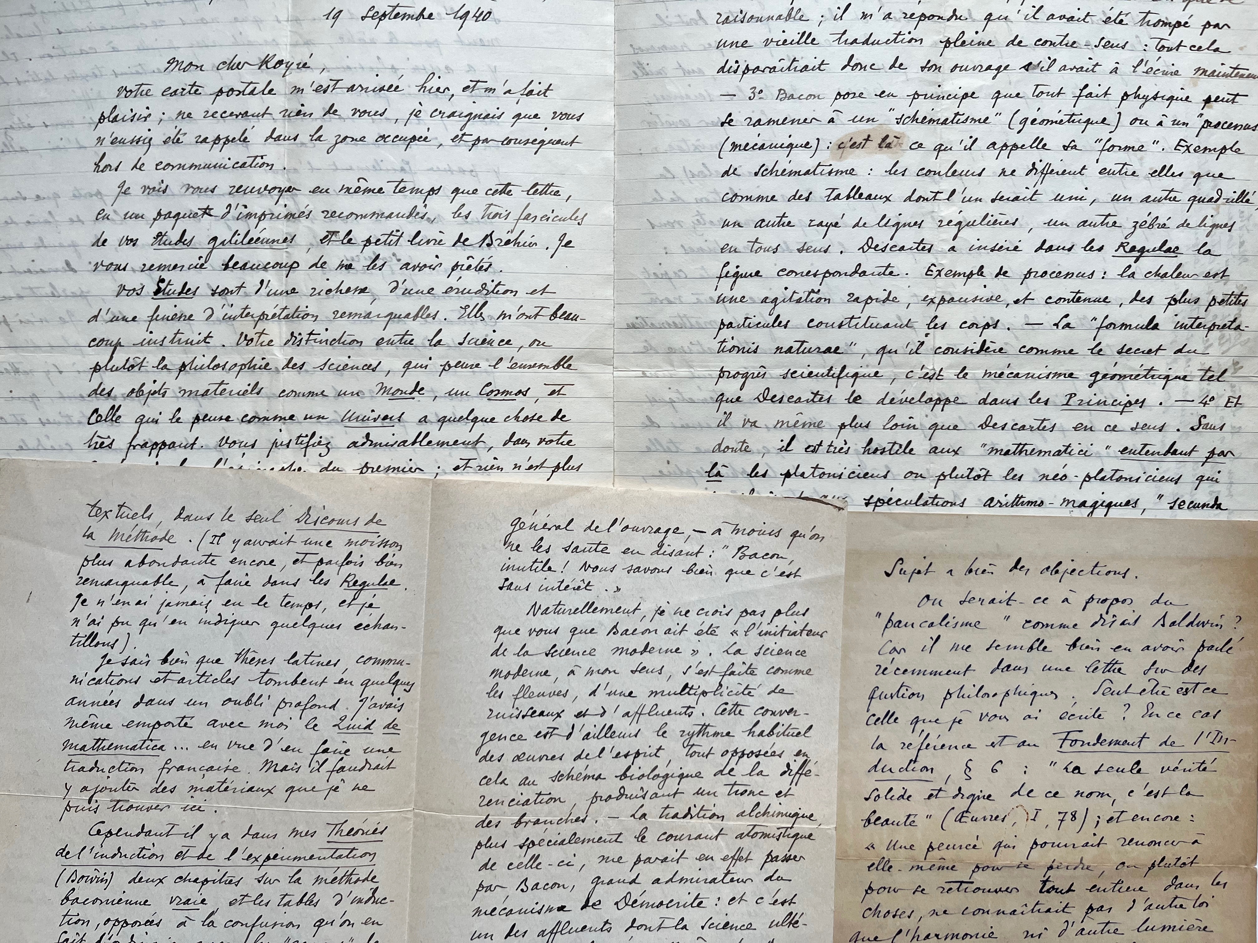 André Lalande (Dijon, 1867/1963)Belles et longues lettres d'André Lalande, écrites d'Albi durant la seconde guerre mondiale, en particulier sur Francis Bacon et sur les Études galiléennes de Koyré, qui « sont d'une richesse, d'une érudition et d'une finesse d'interprétation remarquables. Elles m'ont beaucoup instruit. Votre distinction entre la science, ou plutôt la philosophie des sciences, qui pense l'ensemble des objets matériels comme un monde, un cosmos, et celle qui le pense comme un univers a quelque chose de très frappant […] ». Mais il le contredit sur un point et s'en explique longuement. « Peut-être avez-vous été induit en erreur par le dernier livre de Bachelard, qui fait dire en effet à Bacon quantité de choses absurdes […] ». « Si Bacon n'est pas connu plus exactement, ne croyez pas que ce soit ma faute. Je lui ai consacré ma thèse latine, en 1899 : Quid de mathematica senserit Baconus Verulamius ; en 1900, au Congrès d'Histoire des Sciences, j'ai fait une communication sur ce curieux Valerius Terminus (inachevé, comme toutes ses oeuvres philosophiques) où il esquisse le géométrisme universel à la façon de Descartes, dont il fait une sorte de recette secrète pour les découvertes, à réserver pour des savants qui soient en même temps des sages, tels que ceux de la Nouvelle Atlantide […]. Naturellement, je ne crois pas plus que vous que Bacon ait été « l'initiateur de la science moderne ». La science moderne, à mon sens, s'est faite comme les fleuves, d'une multiplicité de ruisseaux et d'affluents. Cette convergeance est d'ailleurs le rythme habituel des oeuvres de l'esprit, tout opposées en cela au schéma biologique de la différenciation, produisant un tronc et des branches […] ».