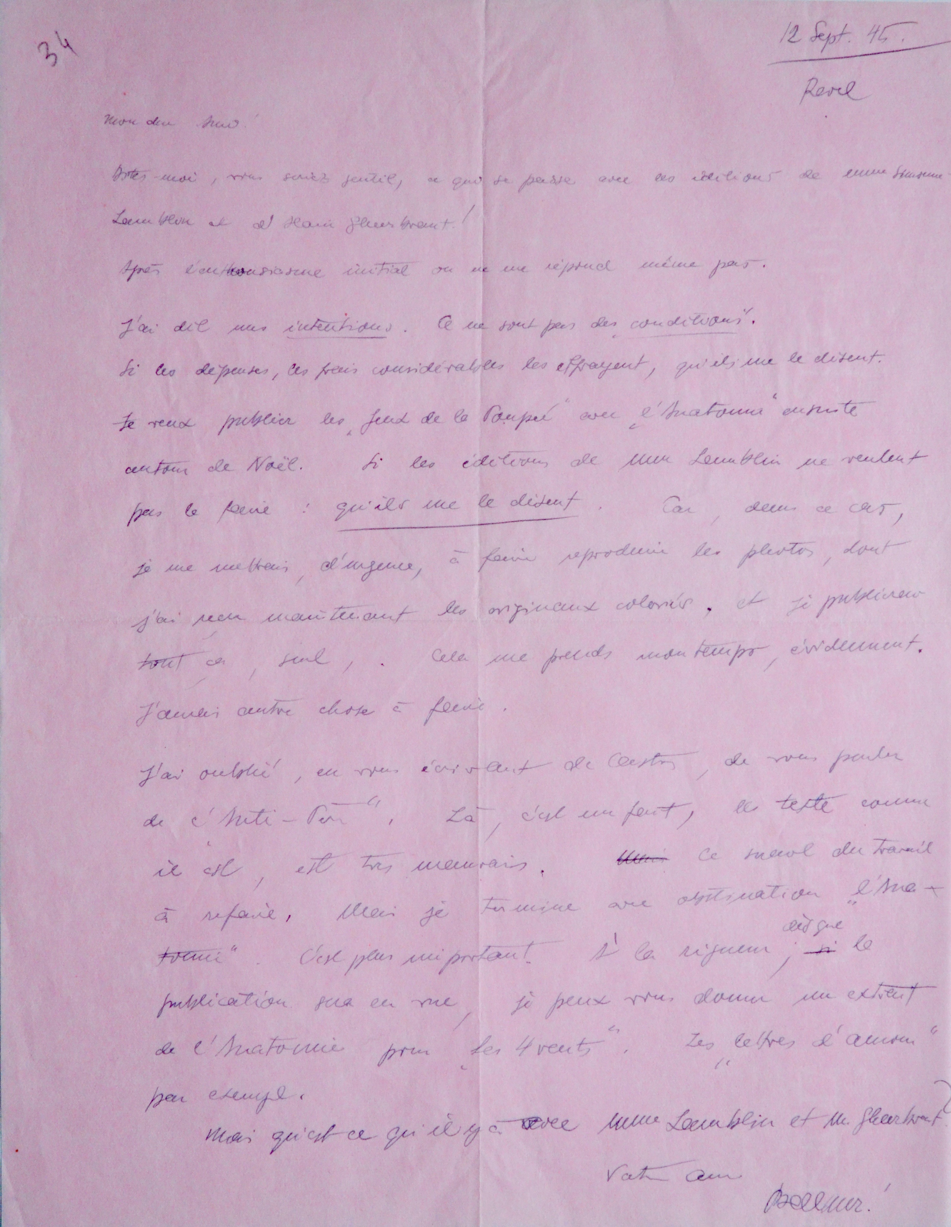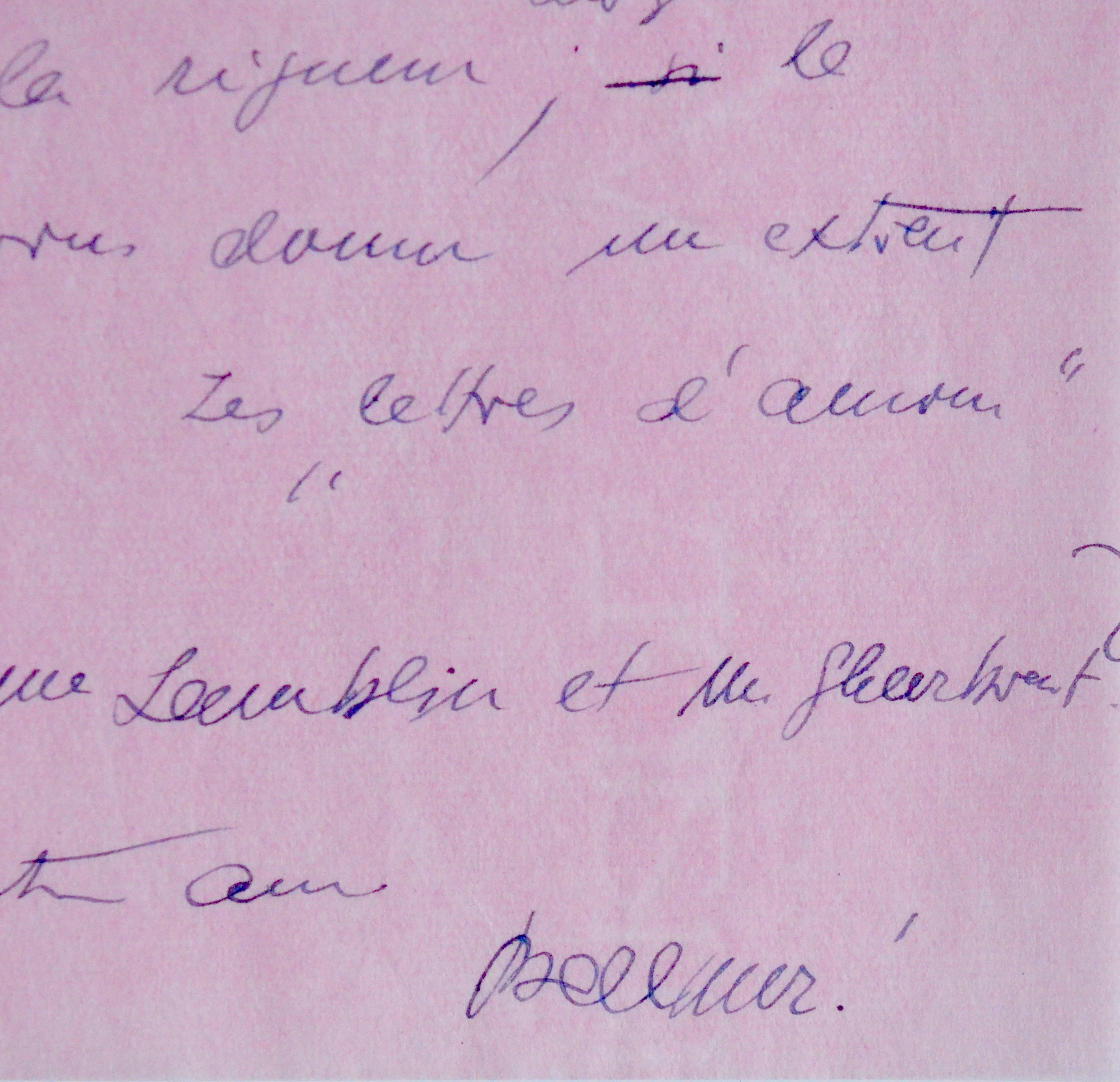 Sans nouvel des éditeurs Simone Lamblin et Alain Gheerbrant [qui fondèrent les Éditions K] qui projetaient d’éditer l’ouvrage de Bellmer, il demande des explications claires : "Après l'enthousiasme initial, on ne me répond même pas. J'ai dit mes intentions. Ce ne sont pas des conditions. Si les dépenses, ces frais considérables les effrayent, qu'ils me le disent. Je veux publier les "Jeux de la poupée" avec "L'anatomie" ensuite autour de Noël. Si les éditeurs de Mme Lamblin ne veulent pas le faire : qu'ils le disent. Car, dans ce cas, je me mettrais d'urgence, à faire reproduire les photos, dont j'ai reçu maintenant les originaux coloriés, et je publierai tout ça, seul [...]". Il évoque ensuite un texte qu'il juge mauvais et ajoute "mais je termine avec obstination l''Anatomie ' c'est plus important !". Il termine son courrier en revenant sur ses propos du début "Mais qu'est ce qu'il y a avec Mme Lamblin et M. Gheerbrant ?".