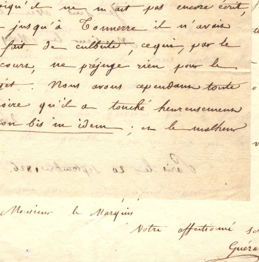 Benjamin Guérard (Montbard, 1797/1854)Guérard informe son correspondant de l'arrivée à Montbard de leur ami commun. «Je suis désespéré, monsieur le marquis, de n'être pas encore allé, cette année, vous faire ma cour dans votre délicieuse campagne ; aujourd'hui que je suis occupé à vider l'une des plus grandes salles de la bibliothèque, et à déménager de chez mon père, pour faire place au nouveau venu, je me trouve réduit à vous prier d'agréer mes excuses [...]». Dans une seconde lettre, il s'engage à faire ce qui est en son pouvoir aussi bien à la Bibliothèque du roi, qu'à celle de l'Institut auprès de Feuillet, pour lui procurer les livres dont il a besoin.