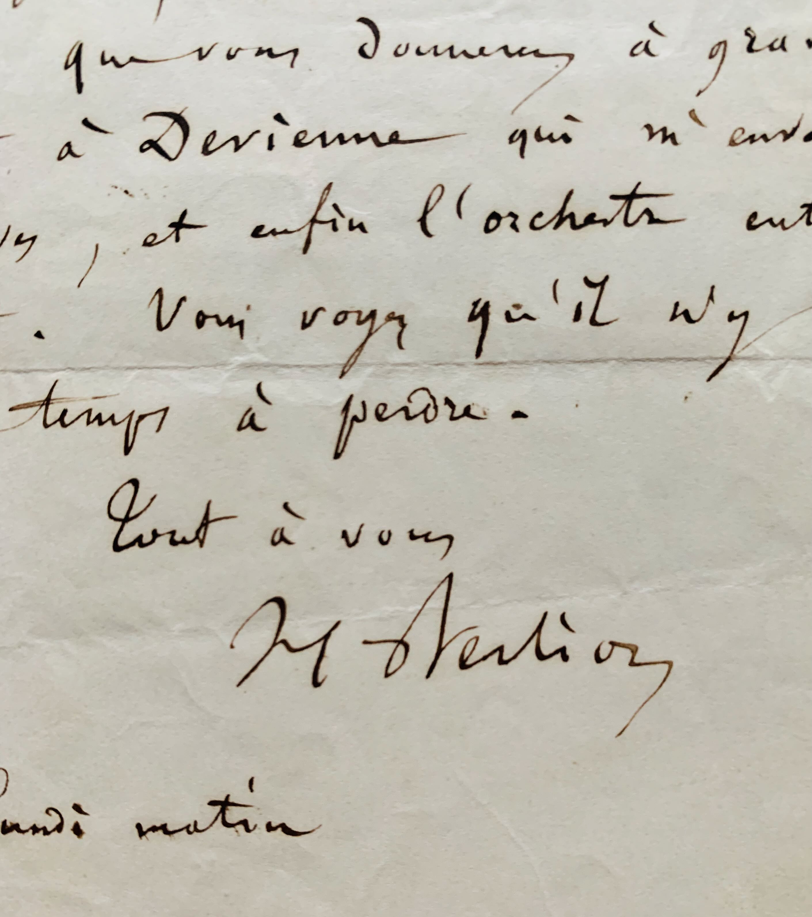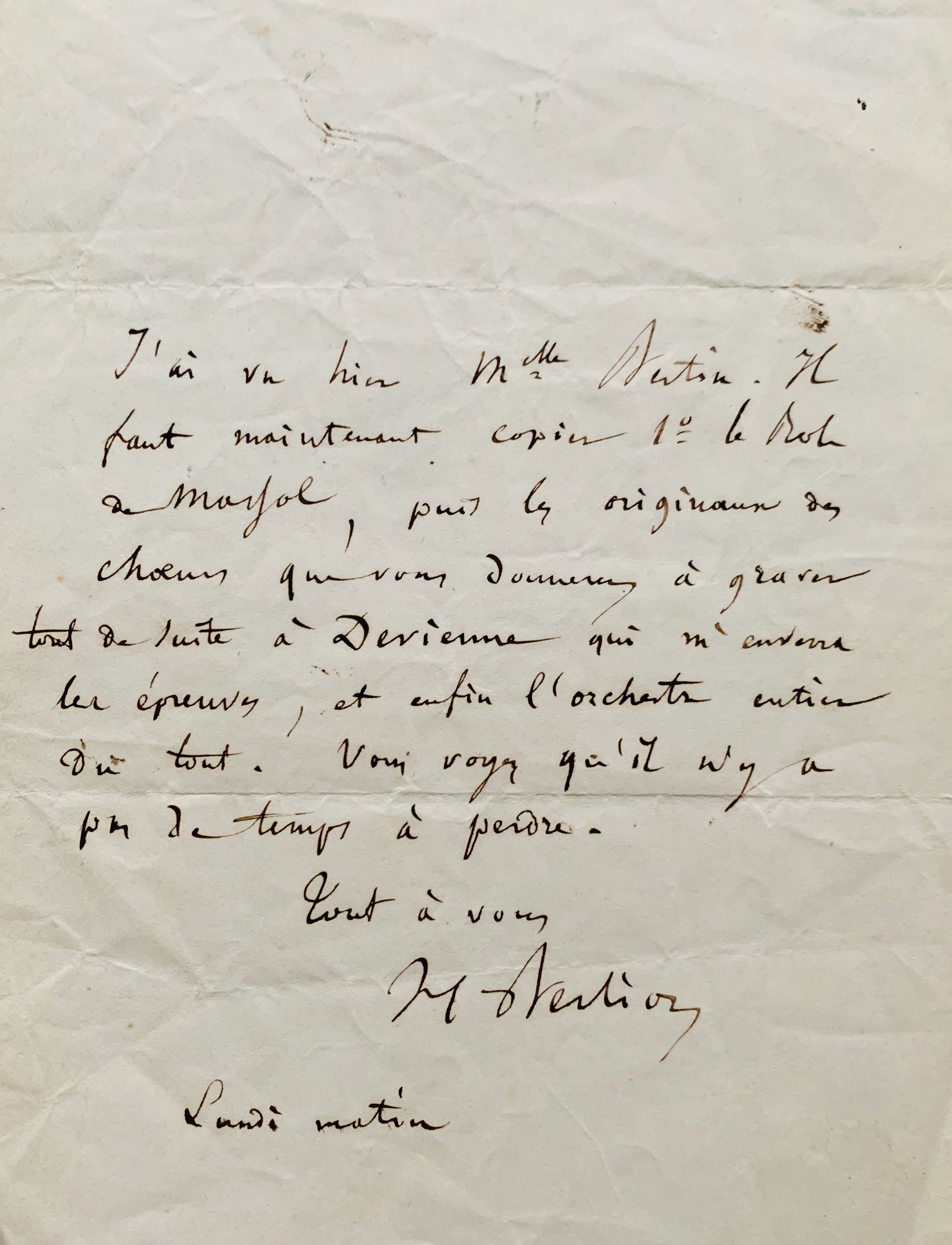 "J'ai vu hier Mlle Bertin. Il faut maintenant copie 1° le rôle de Massol, puis les originaux des choeurs que vous donnerez à graver tout de suite à Devienne qui m'enverra les épreuves, et enfin l'orchestre entier du tout. Vous voyez qu'il n'y a pas de temps à perdre".