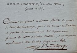 Datée du 7 prairial an 8. A son en-tête de l'armée de l'Ouest : "Bernadotte, Conseiller d'Etat, général en chef".