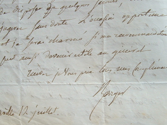 Pierre Antoine Berryer (Paris, 1790/1868)Berryer demande le soutien financier du marquis de Pastoret pour le général Dermoncourt (1771/1847), dont il rappelle le dévouement à la duchesse de Berry et la cause royaliste. «Il vous souvient de la bonne conduite qu'il tint dans l'ouest en 1832, des procédés pleins de convenance et d'égards qu'il sut observer envers madame la duchesse de Berry [commandant le département de Loire-Atlantique, avec mission de mettre fin à l'agitation légitimiste, c'est à lui que la duchesse de Berry voulut se rendre le 7 novembre 1832 ; il la traita avec tous les égards possibles]. Vous savez qu'en ces temps difficiles où les colères du pouvoir s'exercaient violemment et animaient une partie de la population contre les royalistes, le général d'Ermoncourt garda une honorable modération et protégea même grand nombre de nos amis, pour sauver, entre autres, les jours de Martin de Puiseux qu'il accompagna jusqu'en Angleterre [...]».