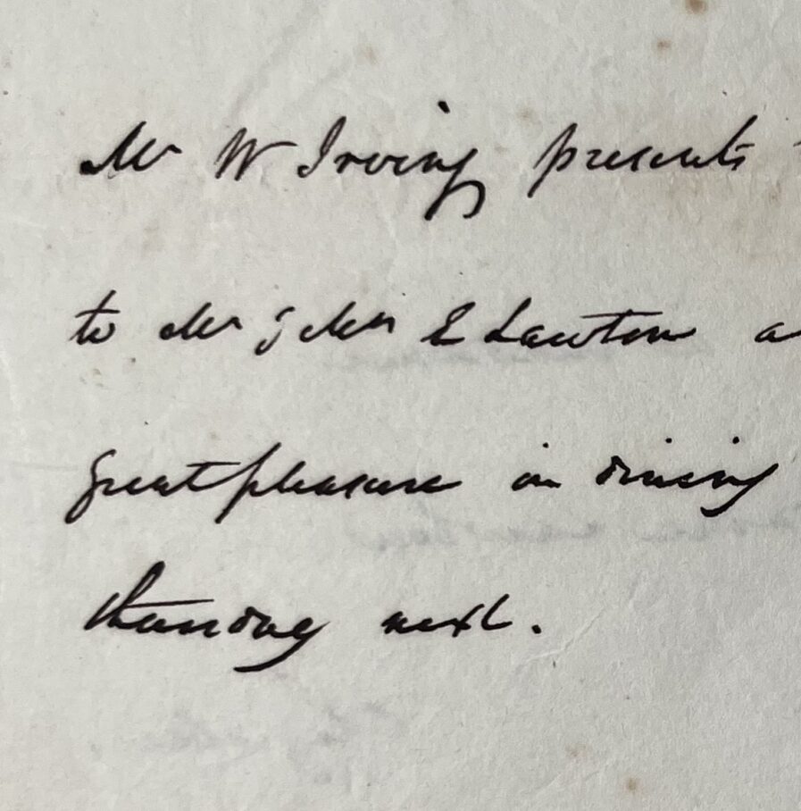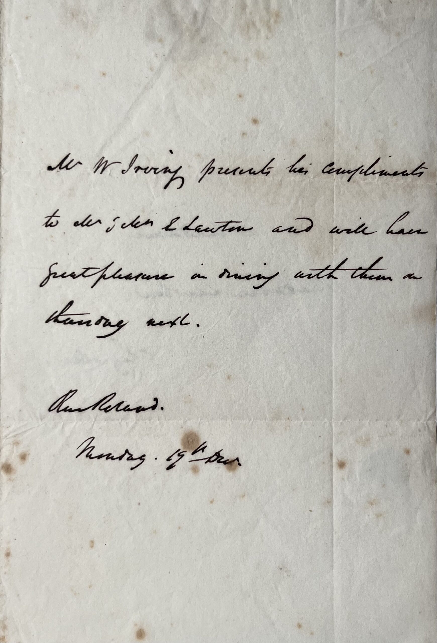 "Mr W Irving presents his compliments to M. & Mrs E. Lawton and will have great pleasure in dining with them on thursday next. Rue Roman. Monday 19th Dec".