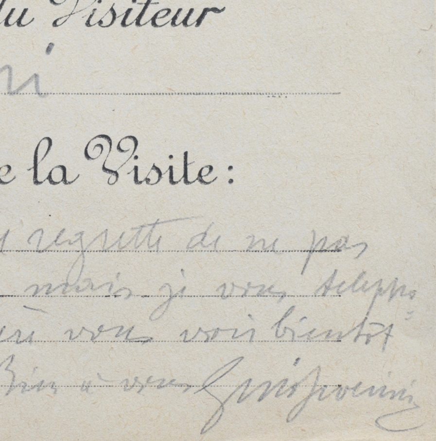 Crayon à papier sur feuillet imprimé "Nom du visiteur" et "Objet de la visite".