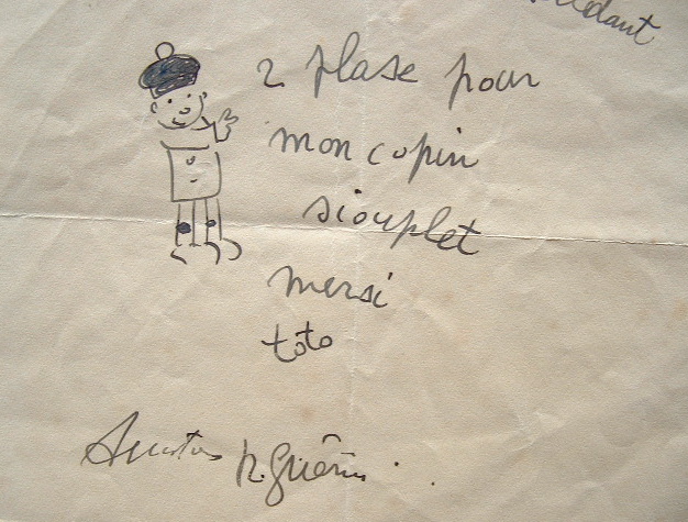 Billet illustré d'un petit personnage humoristique, à l'encre. «M'sieur Herledant, 2 plase pour mon copin siouplet, merci toto. Amitiés R. Guérin».