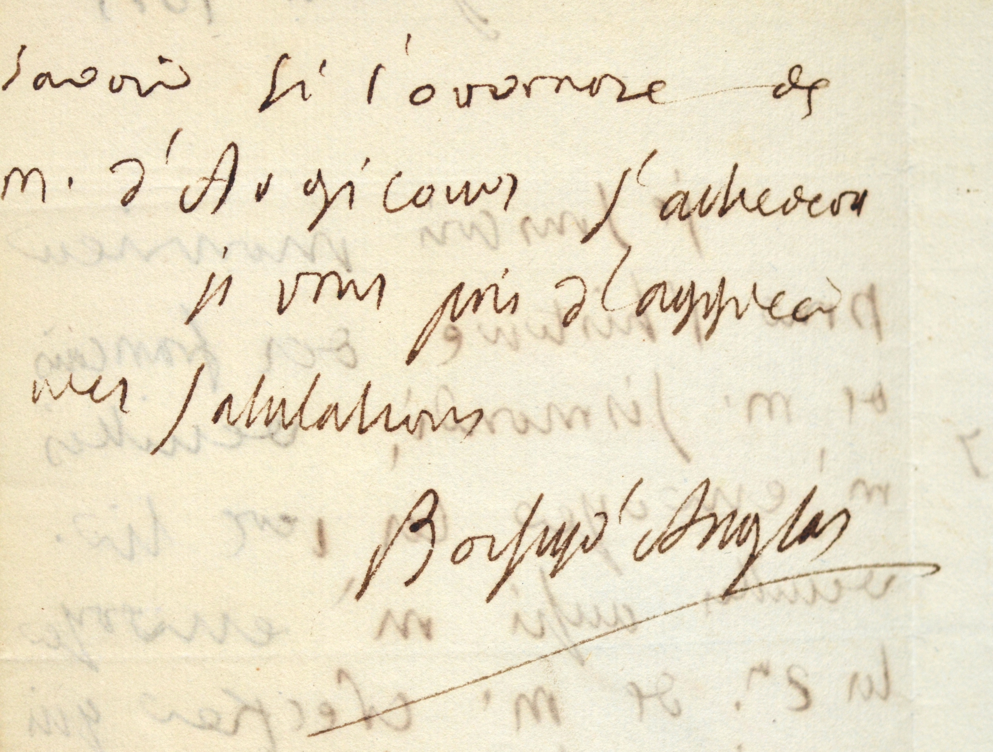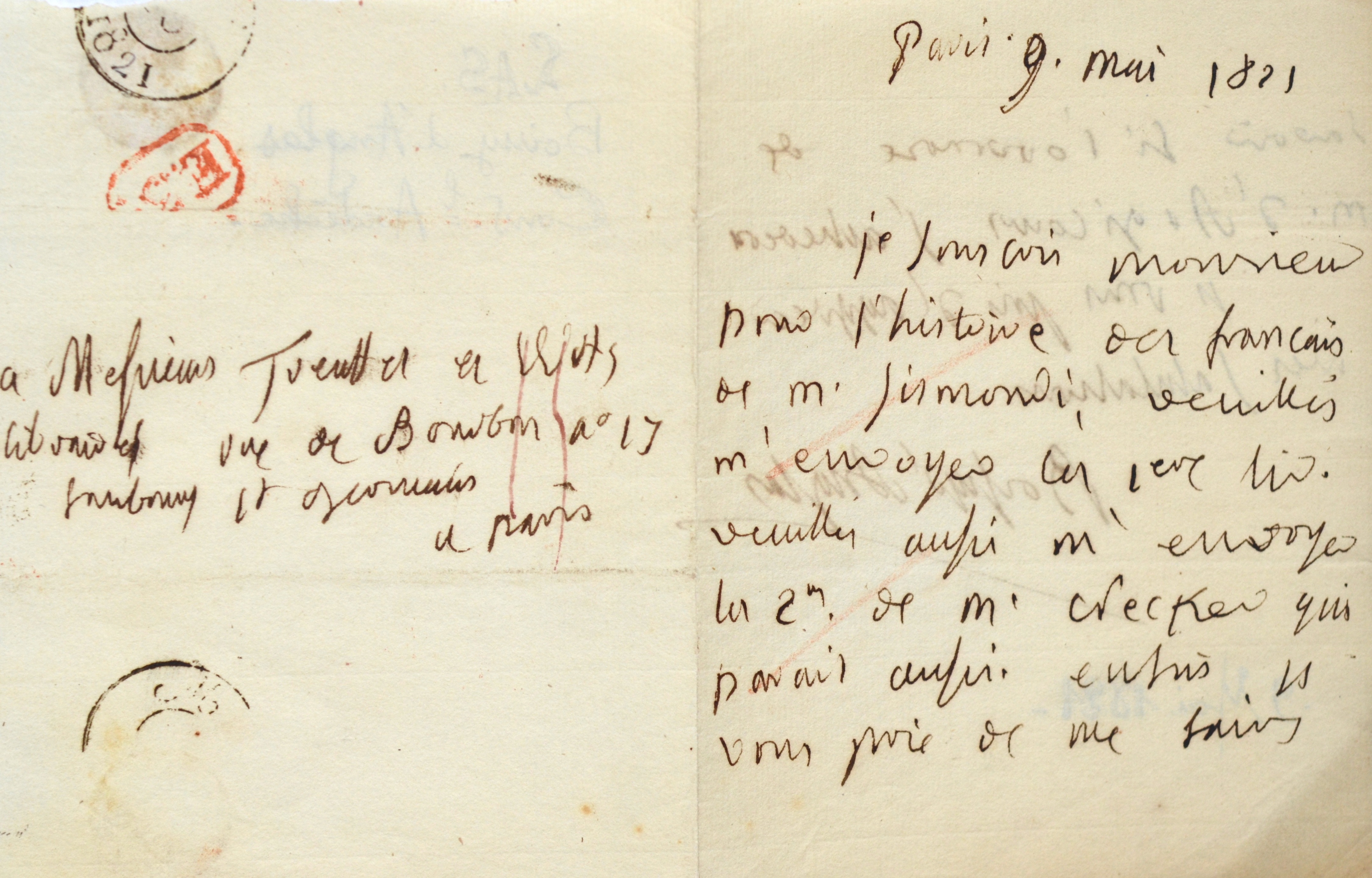 Boissy d'Anglas commande plusieurs ouvrages auprès de l'éditeur Treuttel & Wurtz. "Je souscris monsieur pour l'Histoire des Français de M. Sismondi, veuillez m'envoyer les 1ères liv. [livraisons]. Veuillez aussi m'envoyer la 2è de M. Necker qui parait aussi. Enfin je vous prie de me faire savoir si l'ouvrage de M. d'Argicourt s'achèvera [...]".